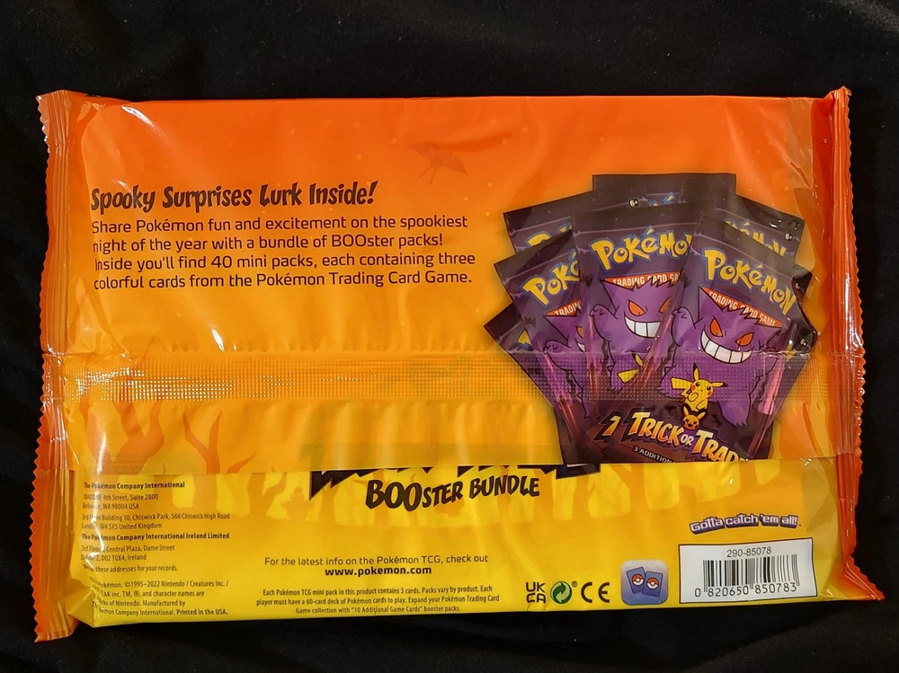 This is one factory SEALED 2022 Pokemon Halloween Trick Or Trade BOOster Bundle - including 40 mini booster packs. Each booster pack contains 3 exclusive Halloween-stamped cards, including fan favorite Pokemon like Gengar, Mewtwo, Pikachu, Mimikyu, Darkrai, etc. These bundles contain more than enough packs for any collector to pull each and every card themselves and complete the entire 2022 set. With any luck, there may even be a few booster packs leftover - a nice addition to any sealed booster pack collection. If you have any questions or if you would like to see more photos, please just message me. This will be packaged with care and shipped USPS Ground Advantage.