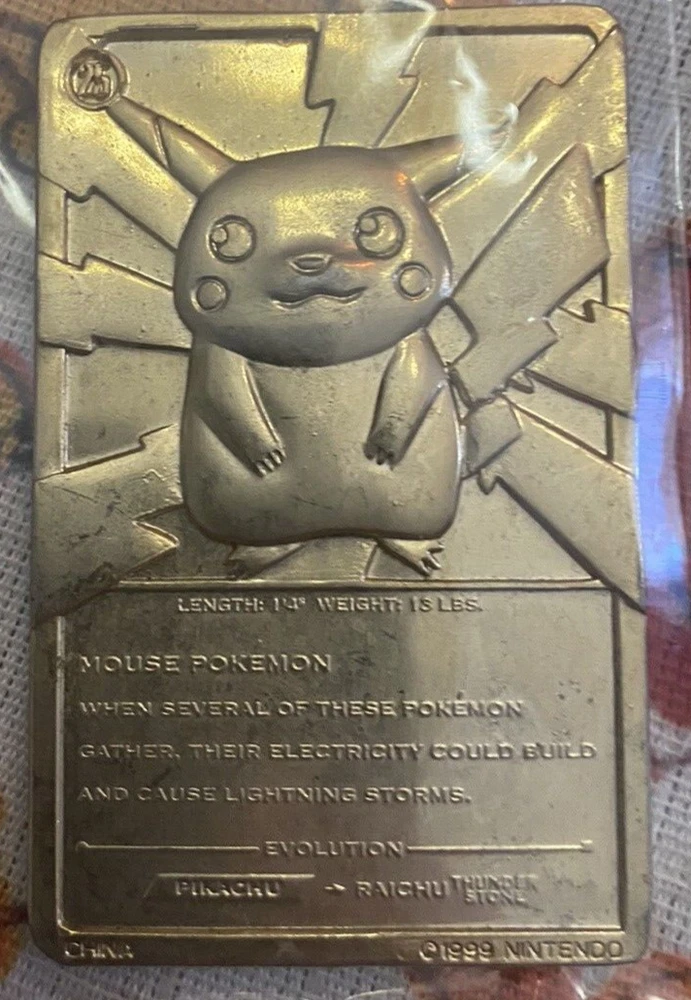 This rare and special edition Pikachu trading card is a must-have for any Pokémon League fan. The card features a stunning gold-plated finish and is made of high-quality metal material. It was manufactured by Nintendo in 1999 and is part of the Burger King set. This vintage card is a perfect addition to any collector's set and is sure to impress with its unique attributes. The card is in excellent shape and has been well-preserved over the years. It is a great opportunity to own a piece of Pokémon TCG history.