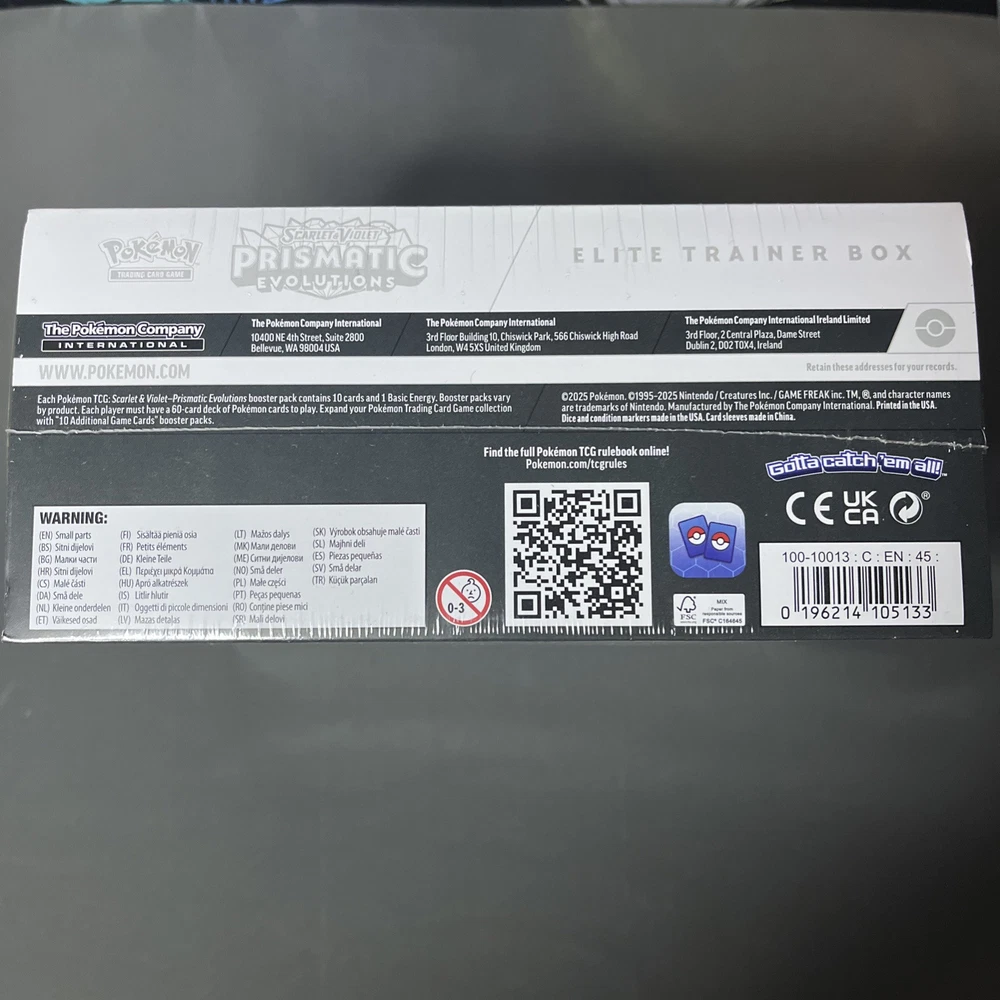Eevee & Friends Light Up with Stellar Colors! From fluffy and fiery to freezing and fanciful, Eevee and its many Evolutions hold a special place in the hearts of Pokémon Trainers across the land! Discover their unique new powers as Stellar Tera Pokémon ex, and look for treasure of your very own across a grand gathering of Pokémon ex from Paldea and beyond. Glittering gems and hidden patterns await at the end of the rainbow in the Pokémon TCG: Scarlet & Violet—Prismatic Evolutions expansion! . The Pokémon TCG: Scarlet & Violet—Prismatic Evolutions Pokémon Center Elite Trainer Box includes: •9 Pokémon TCG: Scarlet & Violet—Prismatic Evolutions booster packs •Each booster pack contains 10 cards and 1 Basic Energy. Cards vary by pack. 1 full-art foil promo card featuring Eevee • 65 card sleeves • 45 Pokémon TCG Energy cards • A player’s guide to the Scarlet & Violet—Prismatic Evolutions expansion 6 damage-counter dice • 1 competition-legal coin-flip die • 2 plastic condition markers • A box to hold everything, with 4 dividers to keep it organized • A code card for Pokémon Trading Card Game Live