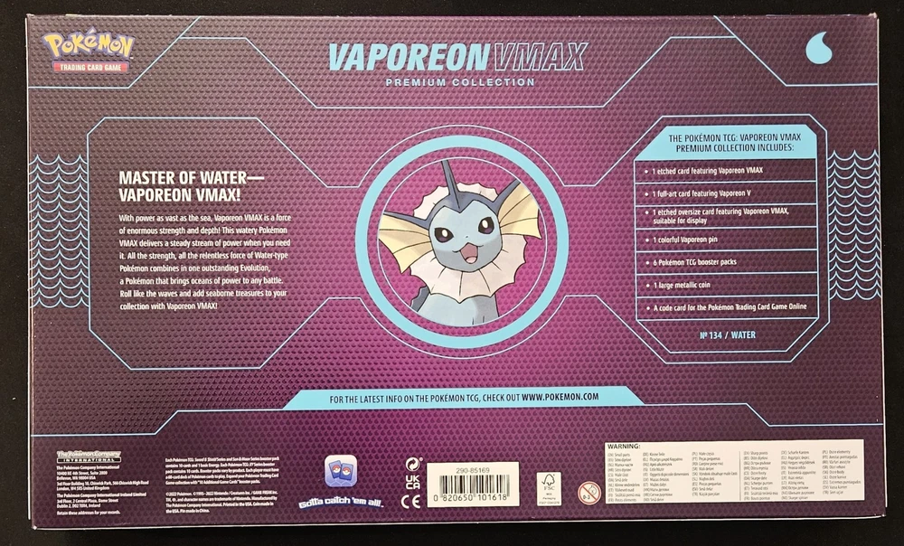 Pokémon Vaporeon VMAX Premium Collection New Factory Sealed Evolving Skies SWSH. Minor imperfections present in packaging. Returns are not accepted. Please reach out with any questions. Shipping info: All graded cards are shipped securely in bubble mailer and cardboard box; regardless of price. TCG singles/playsets are shipped PWE with tracking when applicable. Single cards will be packaged with penny sleeve, top loader and team bag. Playsets will be penny Sleeved in a Card saver 2. Please note that PWE orders will have fewer tracking updates and may show delivered when scanned through your states/cities sortation center or post office. Final delivery may take up to 5 days after this date to arrive to your home. PWE orders from Puerto Rico need to have The United States listed as your country. Orders with Puerto Rico listed as the country cannot be shipped and may be cancelled. Please reach out with any concerns before contacting ebay and we'd be happy to assist you. Please note that due to inventory accuracy, cancelations/refunds are not accepted before or after an item has been shipped to you. Please reach out with any questions before purchase and we would be happy to assist you.