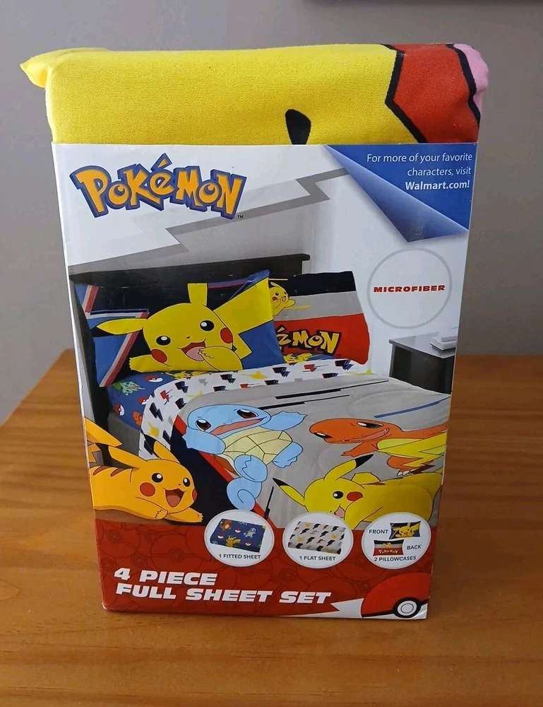 Transform your child's bedroom into a fun and vibrant Pokemon lair with this 4 piece full sheet set. The set includes two double-sided pillowcases and two sheets, all made of soft and durable microfiber material. Featuring a colorful pictorial pattern with the beloved Pokemon characters. Care for the set is easy with machine washable instruction. New in package.