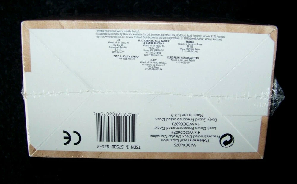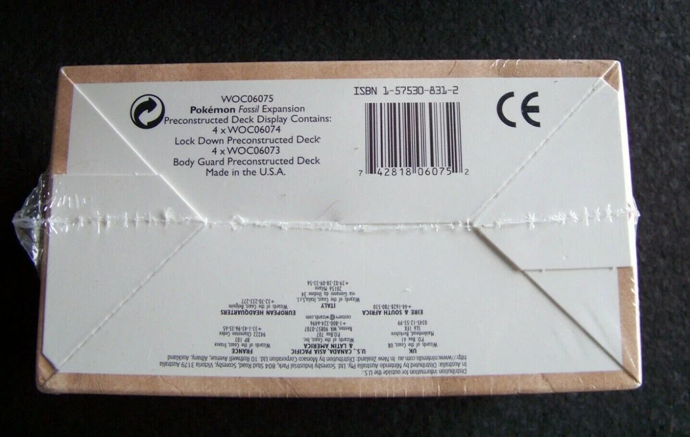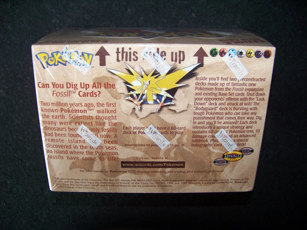Pokemon Fossil 8 Pre Constructed THEME DECK Bodyguard & Lockdown mini case Display WOTC This listing is for eight original factory sealed 1999 Pokemon Fossil preconstructed theme decks in a sealed display box, 4 - Body Guard and 4 - Lock Down decks. Unopened and factory sealed with original Wizards shrinkwrap. "Each deck introduces a unique strategy and contains 60 cards,1 Pokemon coin, 10 damage counters, an advanced rulebook, plus there's a special holographic card in each deck." SECURE SHIPPING This display box will be double-boxed to protect it during transport, not including the original box you are buying. Shipping will be via USPS Registered Priority Mail, Insured Fully , and the extra precautions of Signature Confirmation , Restricted Delivery. SHIPPING TO U.S.A. ONLY. Note - Only one specific person can sign for it and must have appropriate government ID. If upon receipt, the package appears significantly damaged do not accept it and, return it unopened and unaccepted. Inconvenient, maybe, but these are much safer precautions given that USPS, Fedex, and UPS have been instituting policies that are not always secure. PLEASE ASK IF YOU HAVE ANY QUESTIONS. Don’t forget to click on my "Stores" link, next to my eBay name, to see other items I currently have listed for sale, or you can copy and paste this address into your browser: stores.ebay.com/highcountrycollectibles HIGH COUNTRY COLLECTIBLES Since 1989 – A LEADER IN THE DENVER SPORTS MEMORABILIA MARKET. Check out my other auctions and listings, and keep an eye out for the different, unusual, and EXCLUSIVE items available nowhere else but from High Country Collectibles.