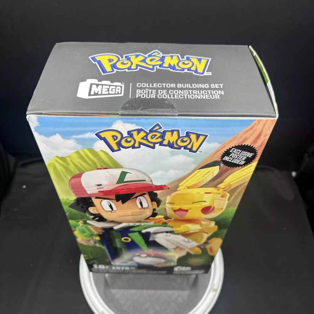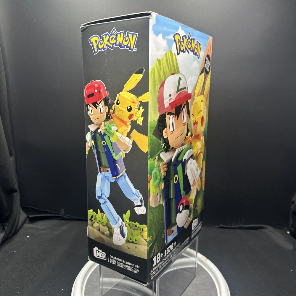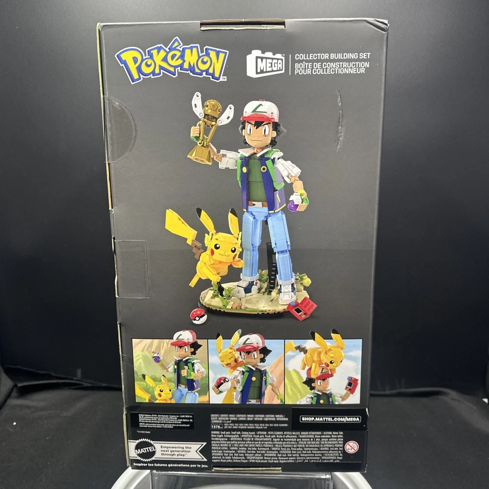 This Pokémon MEGA Collector Building Set features 1576 pieces to create Ash and Pikachu figures. Released in 2023, the plastic blocks come in a box with the theme "Ash & Pikachu: Path to Victory." Suitable for ages 18 and up, the set is part of the Mega Block Collector Building series, showcasing the Pokémon character family. Made by MEGA, this officially licensed product is designed for fans of the Pokémon franchise.