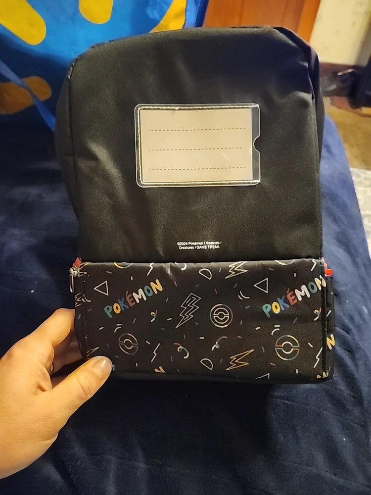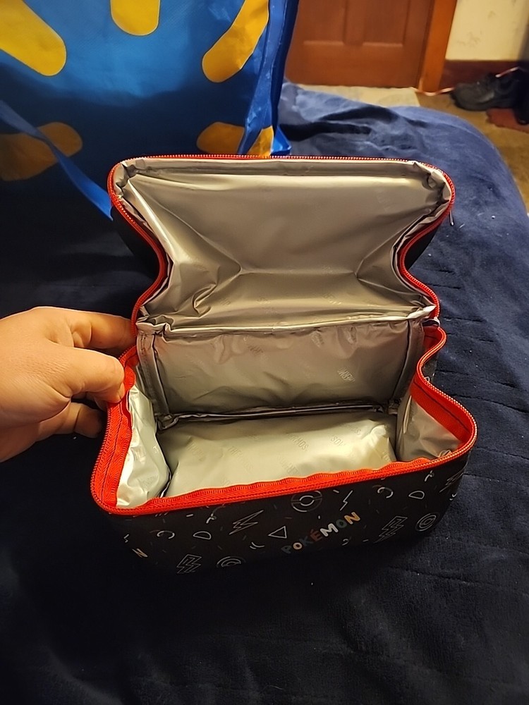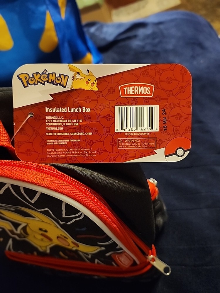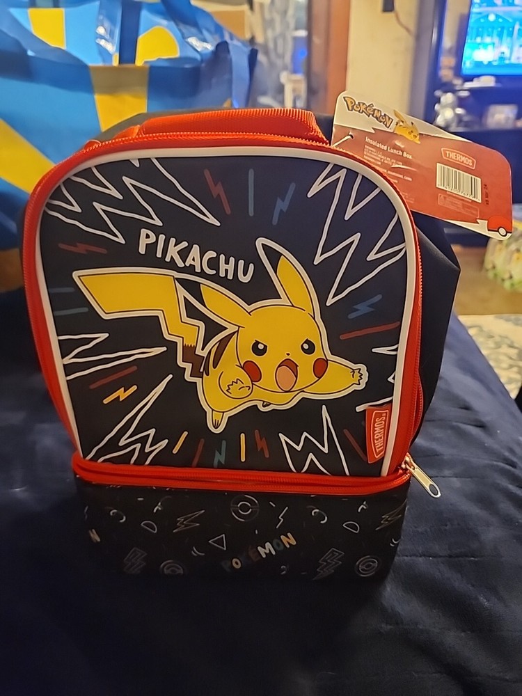 The product is a brand new Pokemon Pikachu Thermos dual compartment lunch bag featuring Pikachu from the Pokémon character family. It has a rectangular shape with a lid that includes a handle for easy carrying. The lunch bag is multicolored and measures 11 inches in height and 8 inches in width. Perfect for fans of Pokémon, this lunch bag is a fun and practical way to carry your meals on the go.