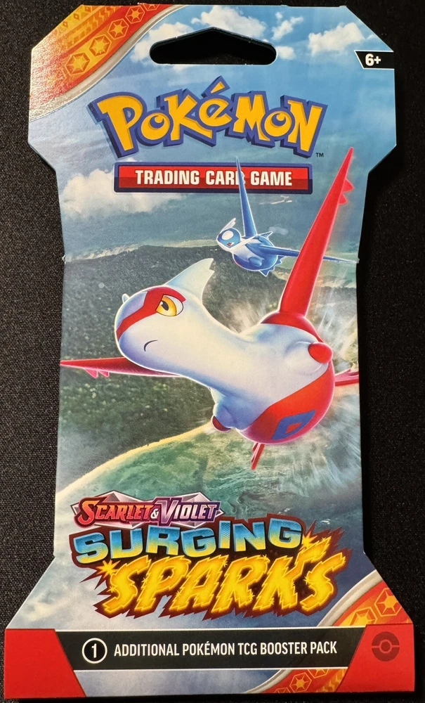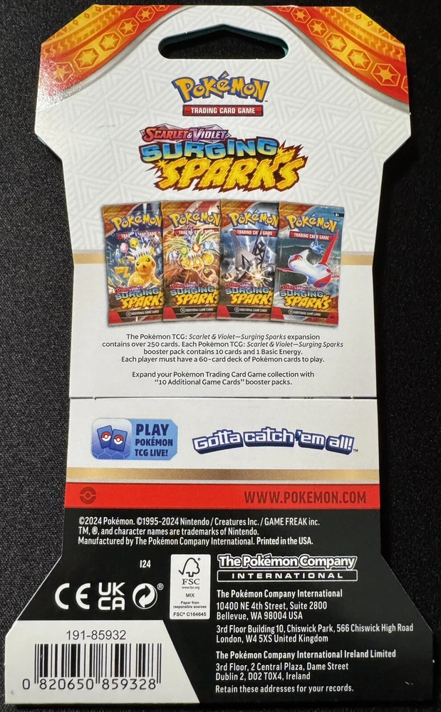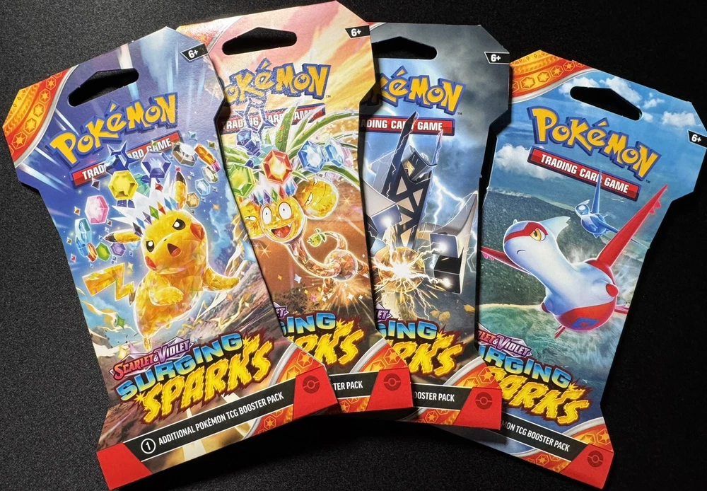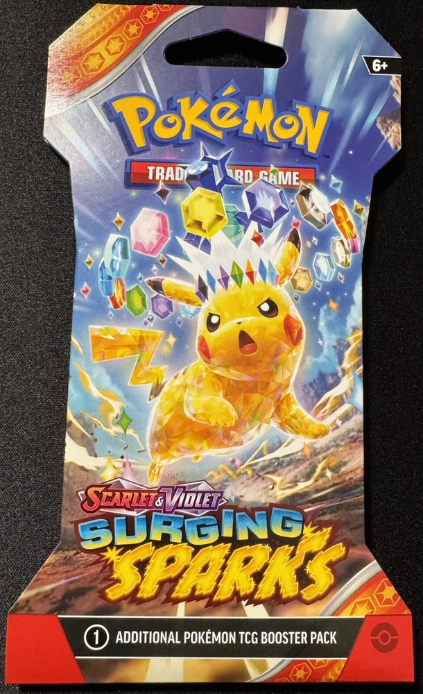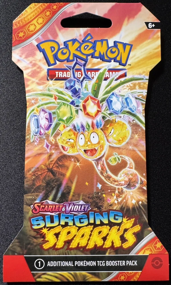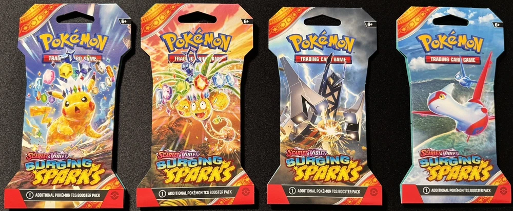 The "Pokemon Scarlet & Violet Surging Sparks Sealed Booster Pack" lot includes 4 packs from the set, each containing 10 cards for a total of 40 cards. These English language packs are from the Pokémon TCG series, manufactured by Pokemon for players aged 8 and above. The standard-sized cards are part of the 2024 release, providing collectors and players with new cards to enhance their gameplay experience. Each pack offers a chance to discover exciting new cards to add to your collection or decks. Each lot of 4 will contain one pack with each of the 4 Surging Sparks mascot Pokémon as shown in the images.
