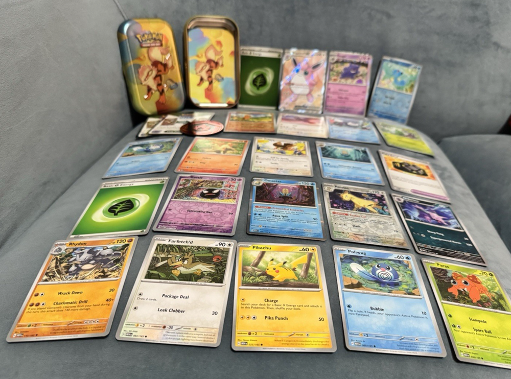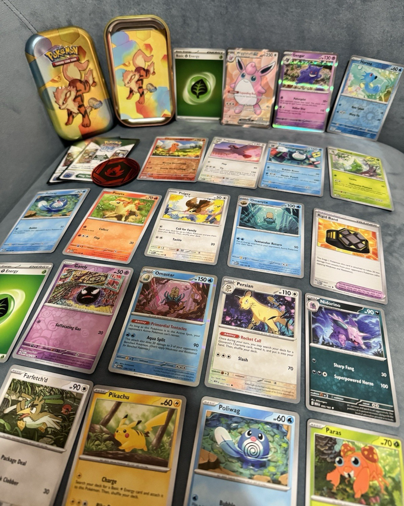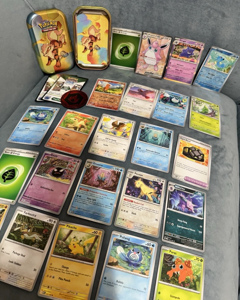 Pokemon Scarlet & Violet 151 Mini Tin- 2 Opened Booster Pack, 1 Energy Coin, 1 Art Card, 1 Foil Promo Card Brand New, Opened Box to Confirm Includes: 2 Basic Energy Cards, 20 Pokemon Cards, 1 Promo Foil Card, 1 Pokemon Artwork, and 2 Pokemon TCG Live Code