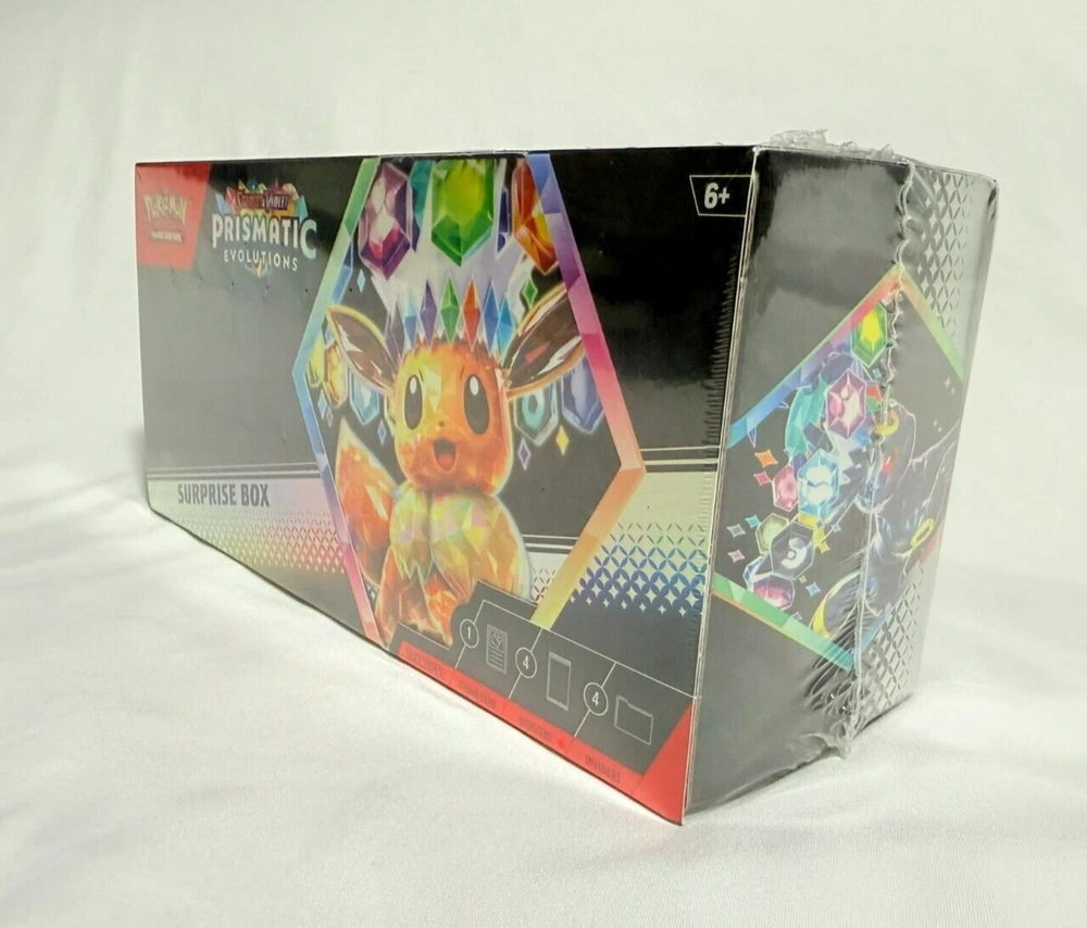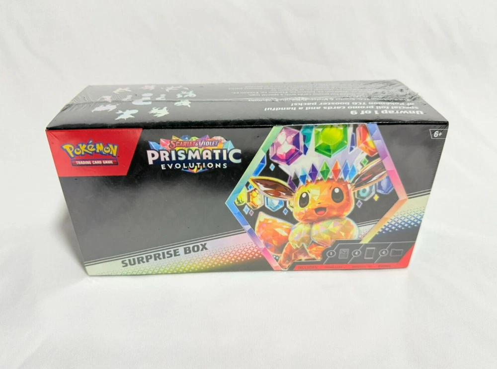 1 promo 4 booster packs 4 dividers Brand new/factory sealed Pokemon TCG: Prismatic Evolutions Surprise Box. The box contains 1 random Evee foil card, 4 booster packs and 4 dividers. Box can be used to organize and store your cards. *Shipping will be USPS Ground Advantage and will ship same day if ordered by 2pm PST on a business day. Feel free to reach out with any questions!