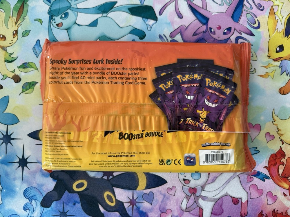 The Pokemon Trick or Trade 2022 Booster Bundle includes 40 mini packs, each containing 3 sealed cards featuring characters like Pikachu and Gengar. The packs are made of standard-sized card stock and are in English language.
