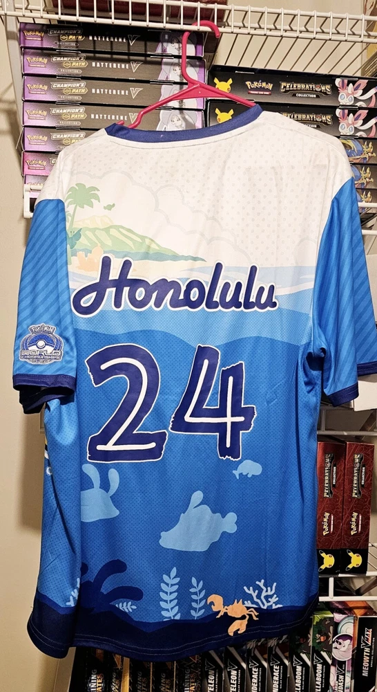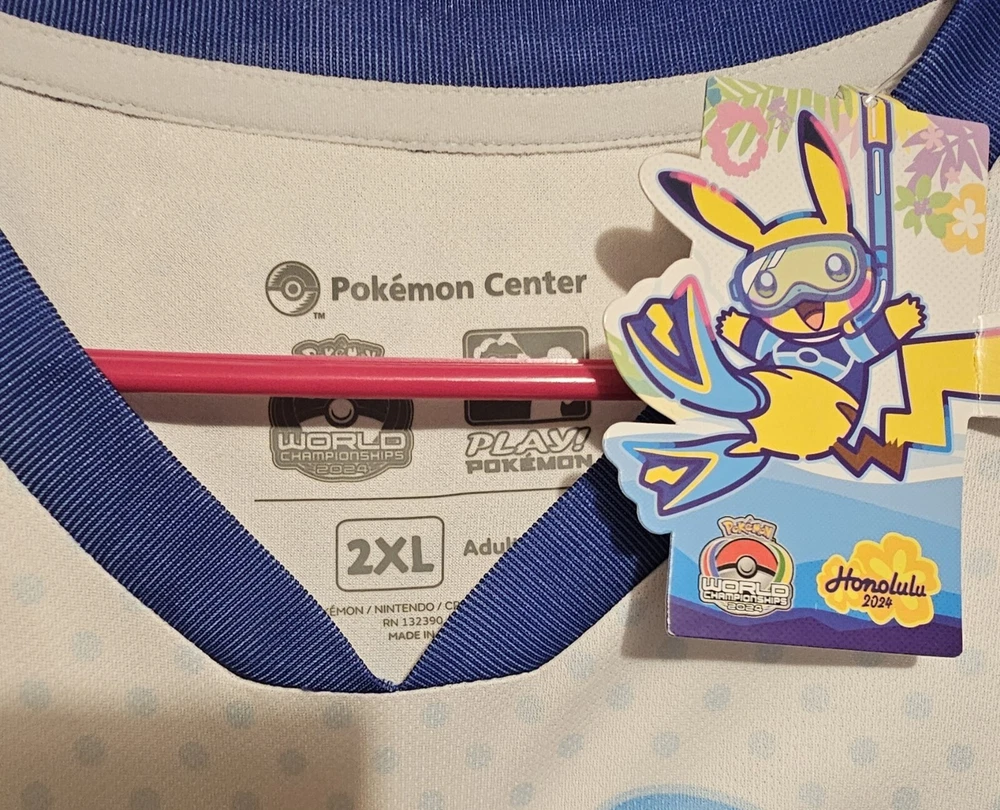 Show off your love for Pokémon with this exclusive jersey from the 2024 World Championships in Honolulu. Featuring Pikachu and a vibrant multicolor pattern, this short-sleeved jersey is made from comfortable polyester fabric in an athletic fit. Perfect for summer, this regular-sized t-shirt is a must-have for any Pokémon fan. Represent your favorite characters and show off your style with this exclusive jersey. Whether you're heading to the tournament or just want to show off your love for the game, this jersey is perfect for you. Don't miss out on this amazing opportunity to be a part of the Pokémon World Championships Honolulu 2024.