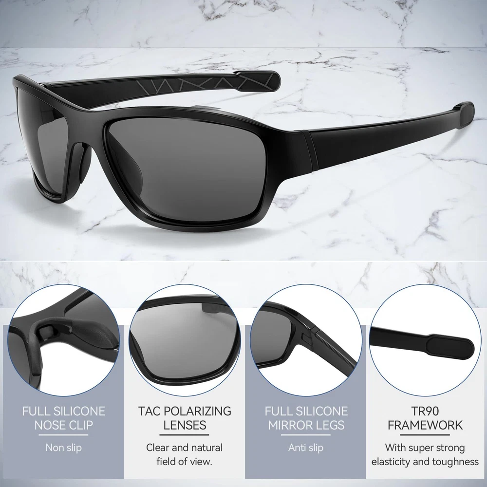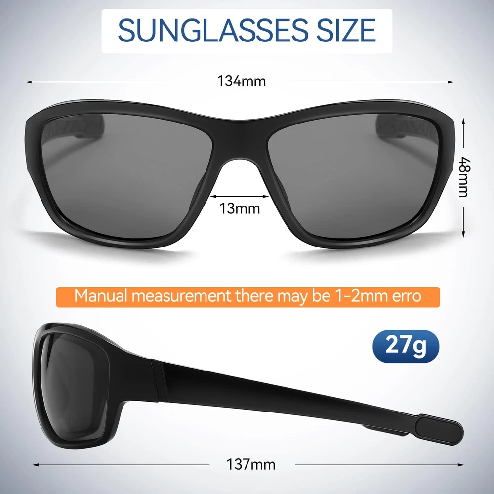😎【100% UV 400 PROTECTION】Our polarized sport sunglasses for men provide excellent eye protection with 100% UV400 protection. The 1.0mm TAC high-definition protective lenses block UVA/UVB rays, eliminate glare, and deliver the most realistic colors. They are also waterproof, sweat resistant, oil resistant, and dirt resistant, ensuring optimal vision and safety during outdoor activities! 😎【TR90 ULTRA LIGHT FRAME】Designed with a TR90 polymer memory material frame, our sport sunglasses for men are ultra lightweight yet highly durable. The frame has strong toughness, impact resistance, and wear resistance, ensuring long-lasting performance. The rubber materials added to the legs and nose clip offer excellent hydrophily, preventing the glasses from falling off during high-intensity sports! 😎【ERGONOMIC DESIGN】Featuring a streamlined design, our sport sunglasses tightly fit the face, reducing wind resistance and providing a comfortable fit. Whether you're running or cycling, these sunglasses offer a secure and snug fit, allowing you to enjoy outdoor activities without any worries! 😎【MULTI-PURPOSE SPORTS SUNGLASSES】Our photochromic sunglasses for men are versatile and suitable for various sports and activities. Whether you're driving, riding bicycles or motorcycles, running, fishing, hiking, or engaging in other outdoor activities, our sunglasses provide thoughtful protection and ensure the clearest view, enhancing your performance and enjoyment! 😎【EXCELLENT AFTER-SALES SERVICE】We take pride in offering excellent after-sales service for our products. We provide unconditional free returns and exchanges within 30 days, ensuring customer satisfaction. If you encounter any issues with your sunglasses, our friendly customer service team is always available to assist you!