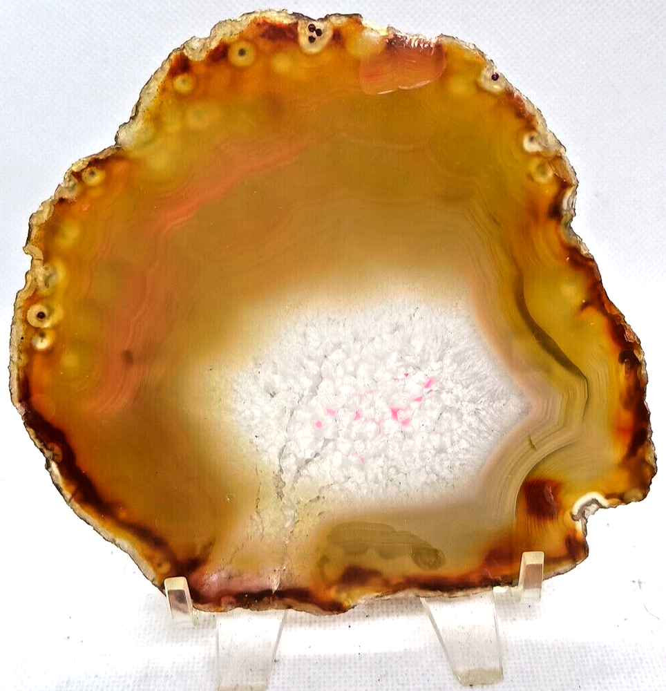 This product is a natural Agate crystal geode slice that weighs 4.2 ounces. The crystal has been polished to give it a smooth finish. It is a type of mineral crystal and is classified under the Agate sub-type. The shape of the crystal is natural, and it has a custom SKU of 4050. The country of origin is unknown.
