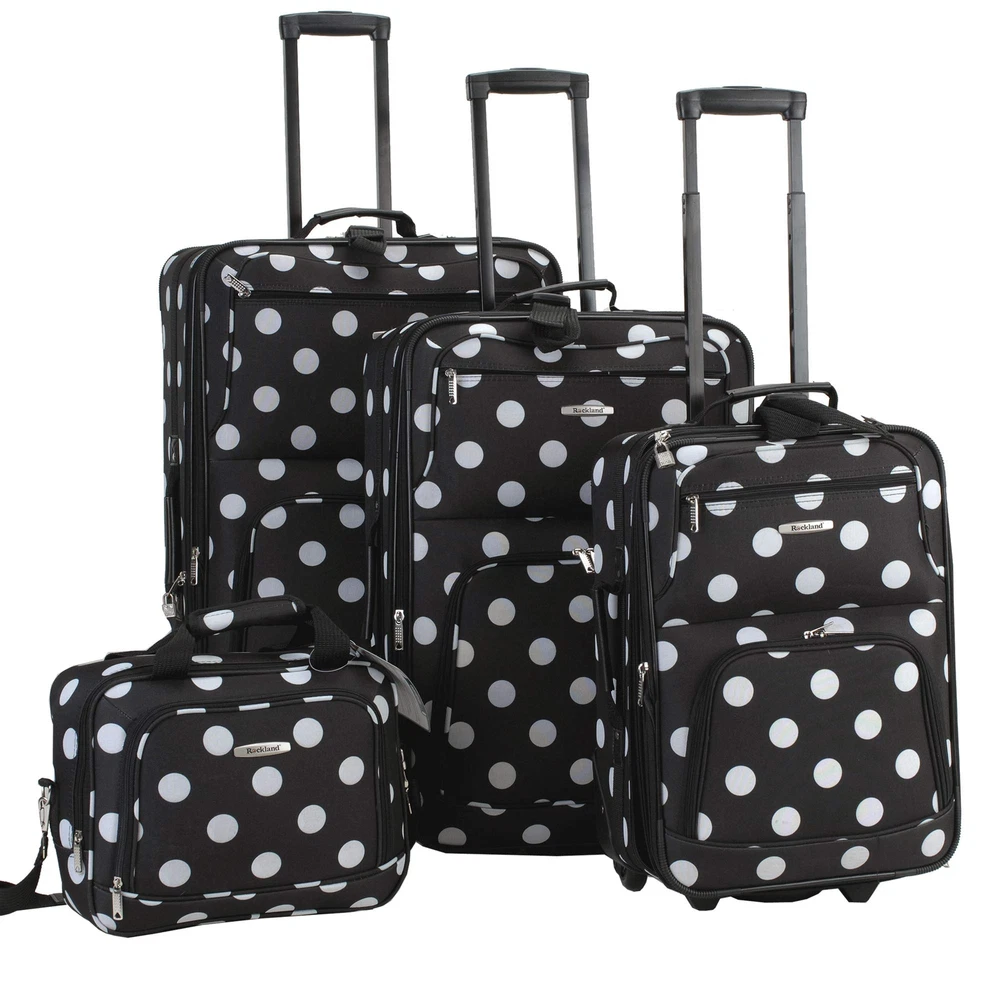 Description This beautiful deluxe 4-piece expandable luggage set is manufactured with a patented heavy duty EVA-molded hi-count fabric. This set is perfect for the serious and experienced traveler! Manufactured with the very best heavy duty polyester and PVC backing, this luggage set is designed for the traveler on the go and comes with three expandable uprights and a flight tote bag. It comes packed with features including: an inside retractable handle, EZ-Roll in-line skate wheels, back zippered secured pockets, top and side comfort grip handle, stability bars at the bottom to avoid tilting, and locks & keys. Upright features include: Clear in-line skate wheel system for smooth ride Push-button self-locking internally stored retractable handle system Ergonomic and comfortable padded top and side grip handles front full size zipper-secured pockets Three internal organizational pockets for all your traveling needs Each upright's interior is fully lined with a durable and elegantly imprinted lining Elegant silver pewter heavy duty industrial hardware Carry-On Flight Tote Bag features include: Elegantly imprinted full interior lining Detachable and adjustable non-slip shoulder strap Spacious main compartment Maximum strength industrial hardware 19-inch Carry-on Upright: 20 inches high x 12. 5 inches wide x 7. 5 inches expandable to 10 inches deep (with wheels). 6 lbs. 24-inch Upright: 24 inches high x 16 inches wide x 10 inches expandable to 12 inches deep. 8 lbs. 28-inch Upright: 28 inches high x 18 inches wide x 12 inches expandable to 14 inches deep. 9 lbs. Carry-On Flight Tote Bag: 14 inches wide x 11 inches high x 5 inches deep – 1 lb. Carry-on Upright: 20"x 12. 5"x 7. 5" (with wheels) 24-inch Upright: 24"x16"x10" 28-inch Upright: 28"x18"x12" Tote: 14"x11"x5" large front pockets Skate wheels Full lining Expandable
