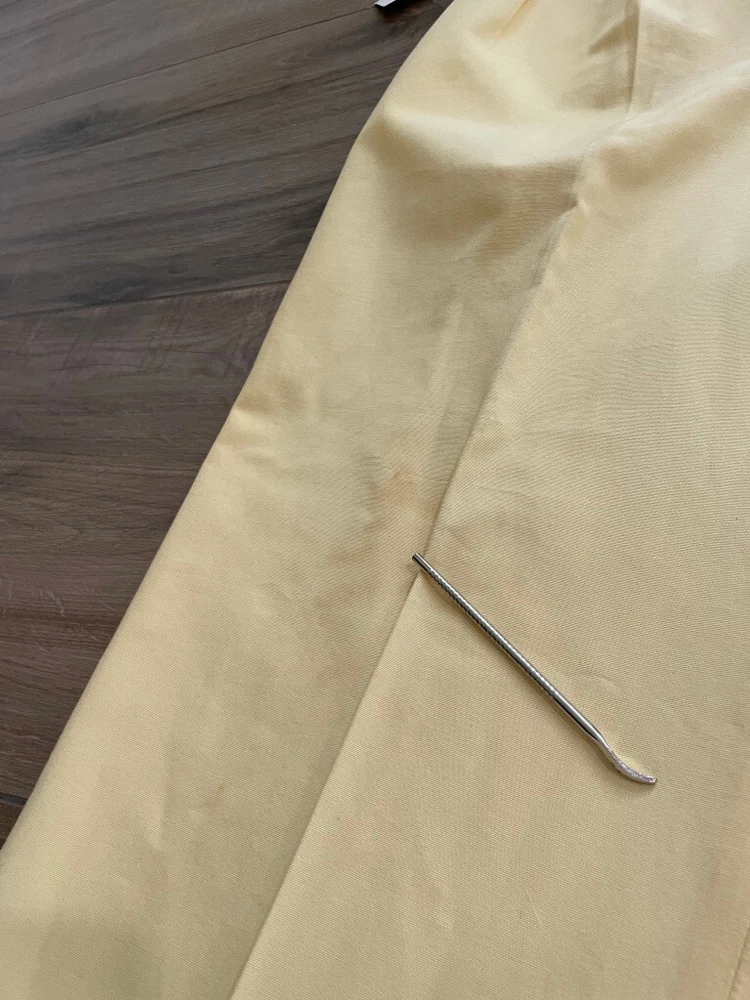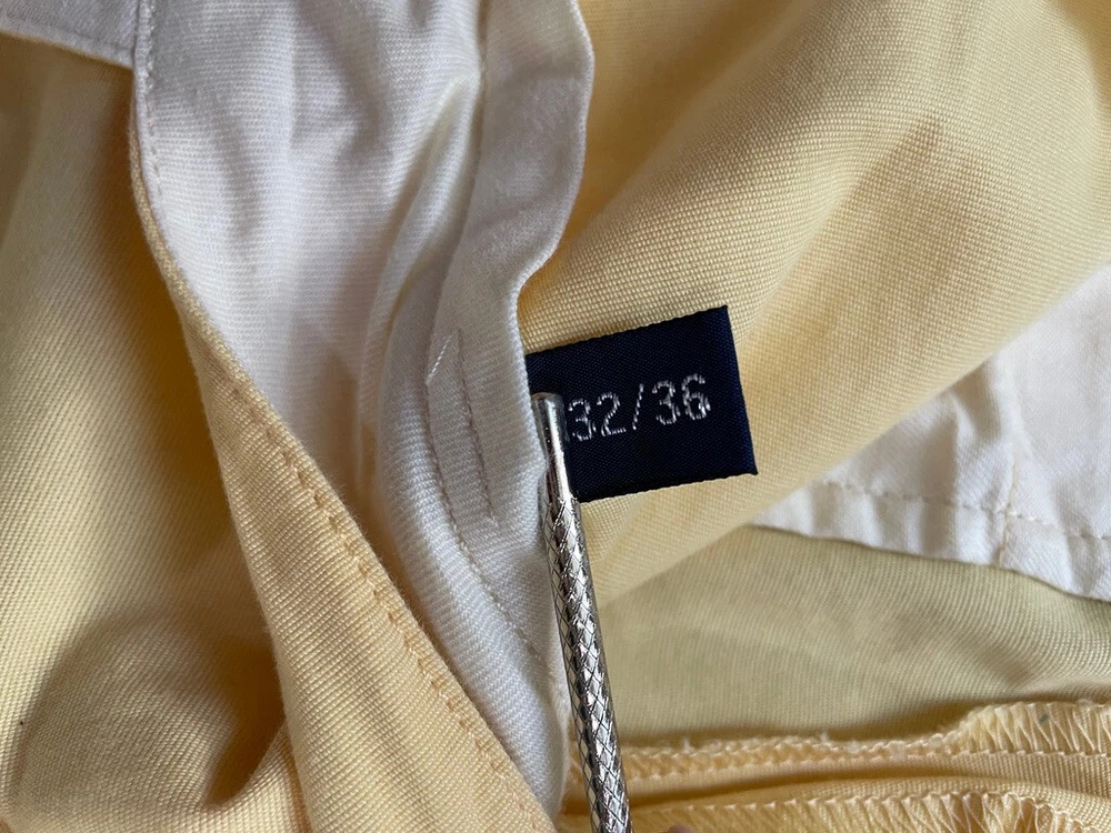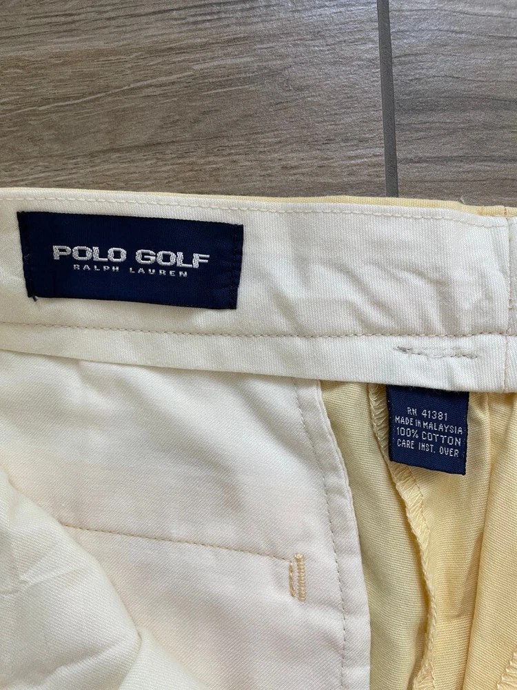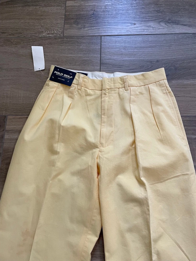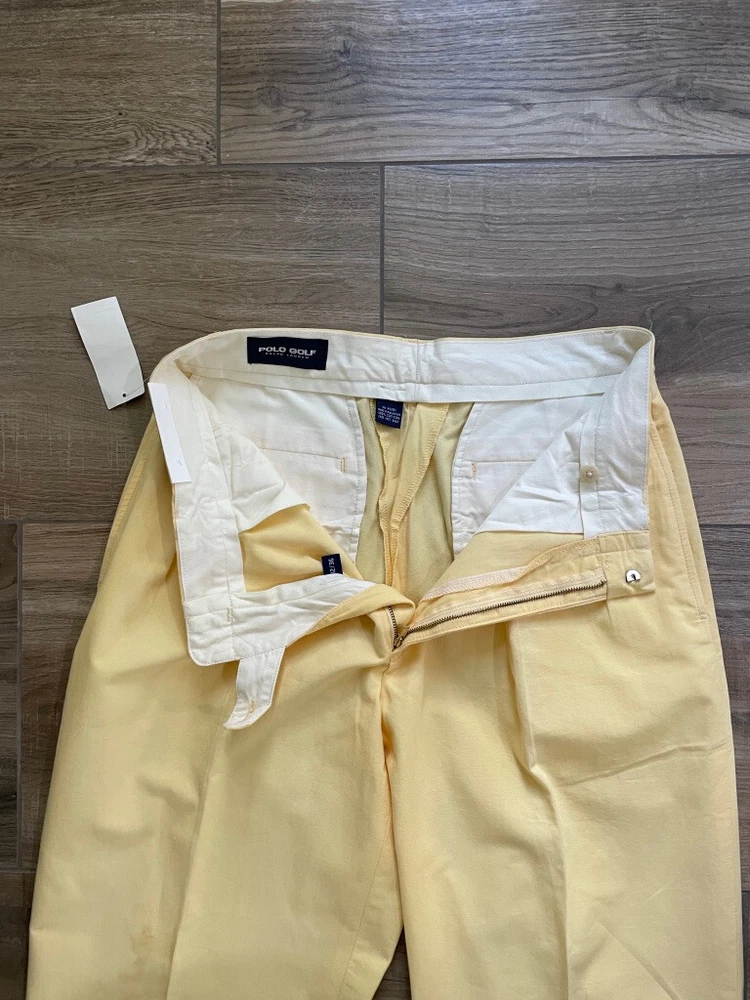 Polo Golf Ralph Lauren Pants Style: Pleated Front Casual Trouser Color: Yellow (brighter color on photos is closer match) Features: Slit and flap button close back pockets Fabric: 100% Cotton Approximate flat measurements: Waist 15 1/2", Rise 13", Inseam 35 1/2" Condition: New with tags/ flaws = with 2 areas of spots shown in last photos that I have not attempted to wash out due to tags Tag Size: 32x36