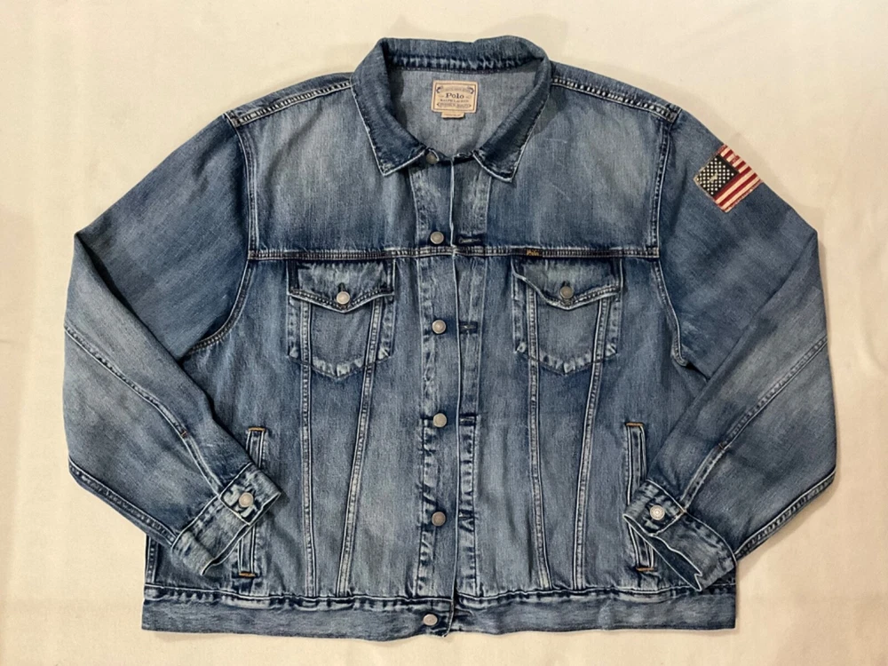 Fall is here and we all could use another layer to put on. Finish your outfit with this timeless Ralph Lauren denim jacket. Preowned in pristine condition, not showing any signs of wear. Size 2XB (big and tall 2xl). Has American flag patch on left shoulder. Measurements are provided in pics description. Comes from smoke and pet free home. Worn 2 seasons. Check my other listings for more designer Ralph Lauren pieces. Make a great Christmas present for brother , husband , father , friend. Combined shipping accepted.