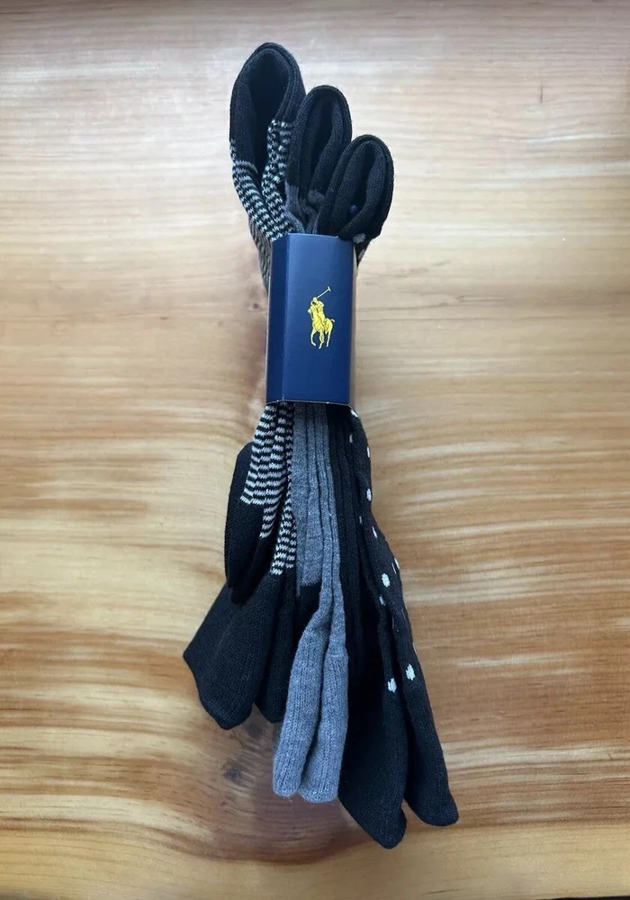 Elevate your sock game with these stylish Polo Ralph Lauren dress socks. Made of a comfortable blend of polyester and spandex, these mid-calf socks feature a polka dot pattern in gray and black, adding a touch of classic elegance to your outfit. Perfect for any occasion, from casual to formal, these socks are lightweight, breathable, and machine washable for easy care. With a size of 10-13 and a regular size type, these socks are perfect for men who love to walk, golf, or dance. The socks also feature the iconic Polo Ralph Lauren logo, adding a touch of luxury to your look. Get ready to rock any season, whether it's winter, summer, fall, or spring.
