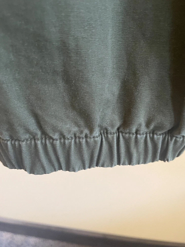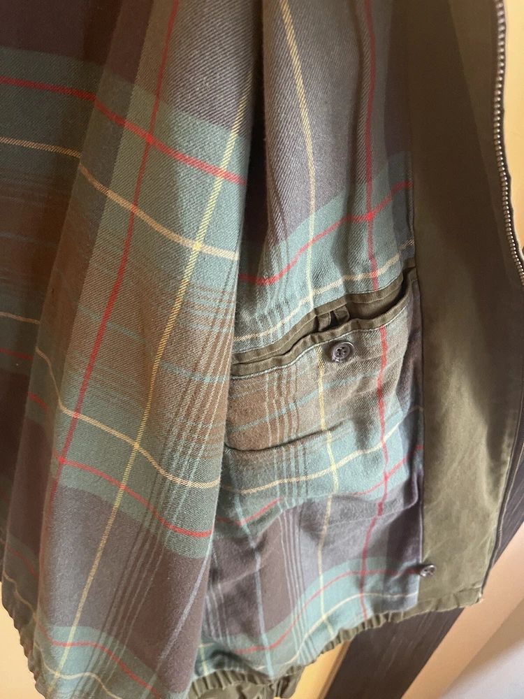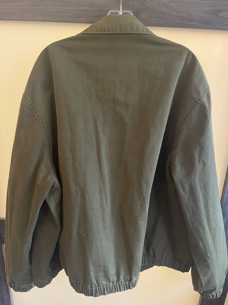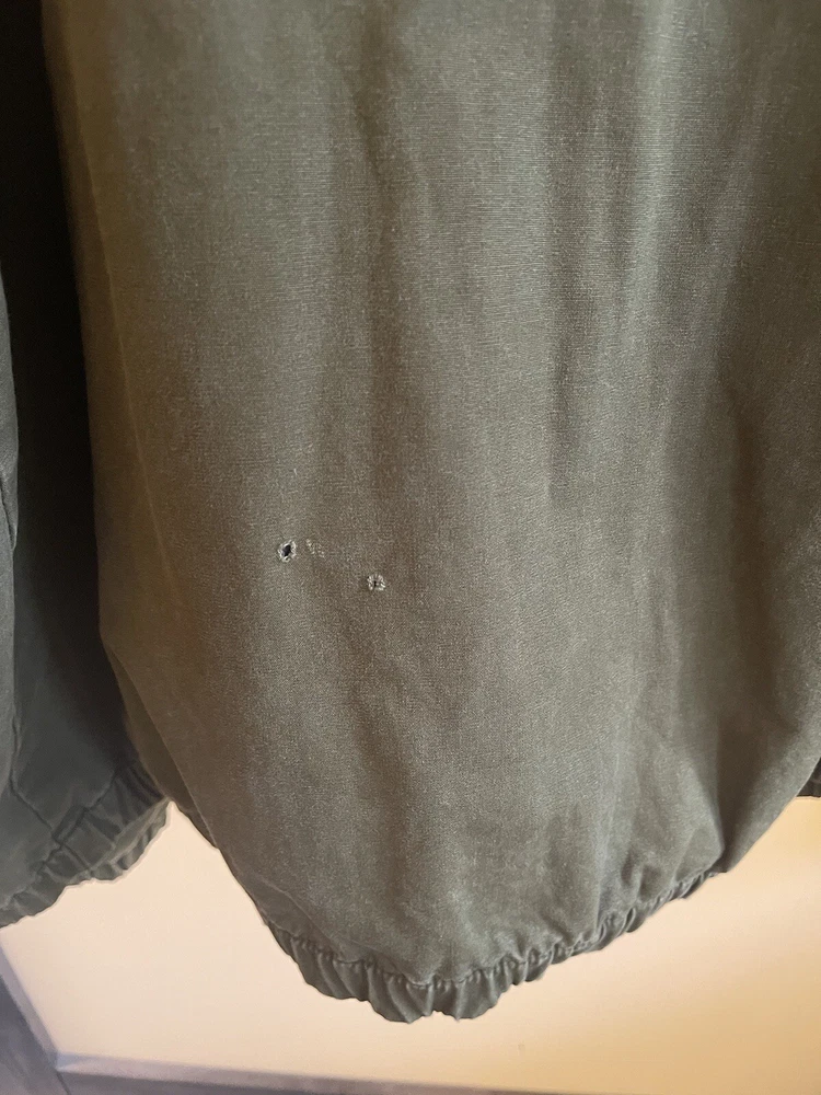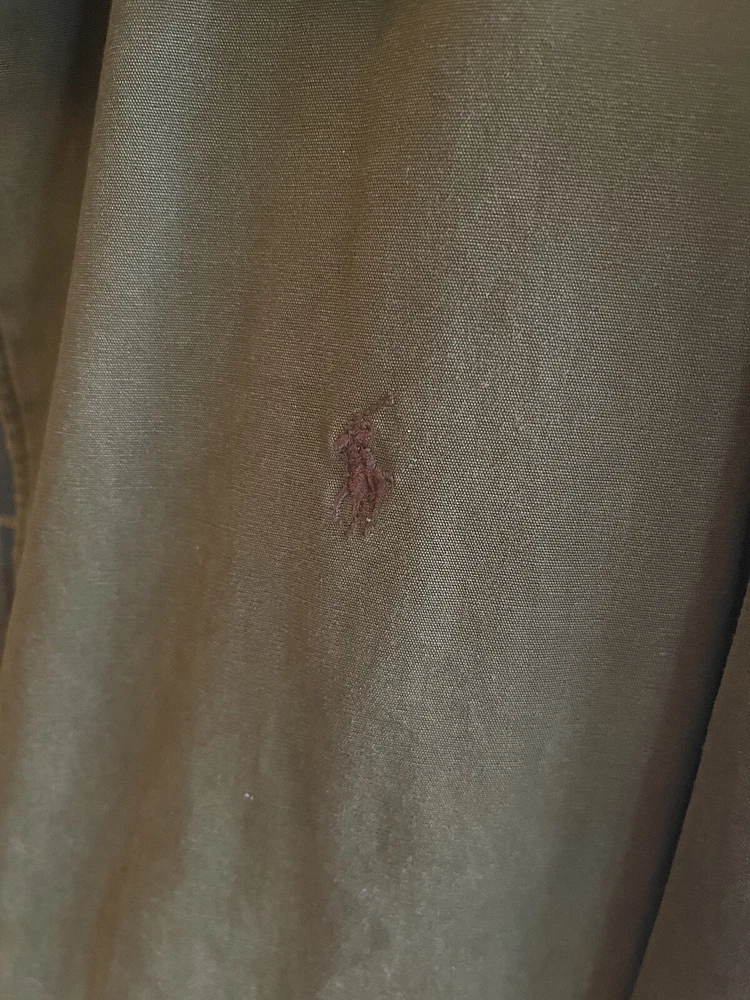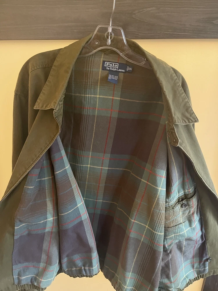 This Polo Ralph Lauren jacket is a must-have for any fashion-forward man. The olive green color and flannel lining make it a versatile piece for any occasion. With a size of XXL and a regular size type, this jacket is perfect for men who want to look stylish and feel comfortable. The jacket has a couple of defects, but they do not affect its overall look. It is a great addition to any wardrobe and can be paired with any outfit. The jacket's features include a lined interior and exterior, making it a perfect choice for colder weather. Get this jacket today and add a touch of sophistication to your wardrobe. Defects pictured two small holes