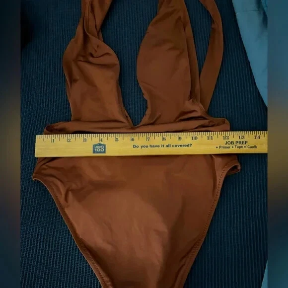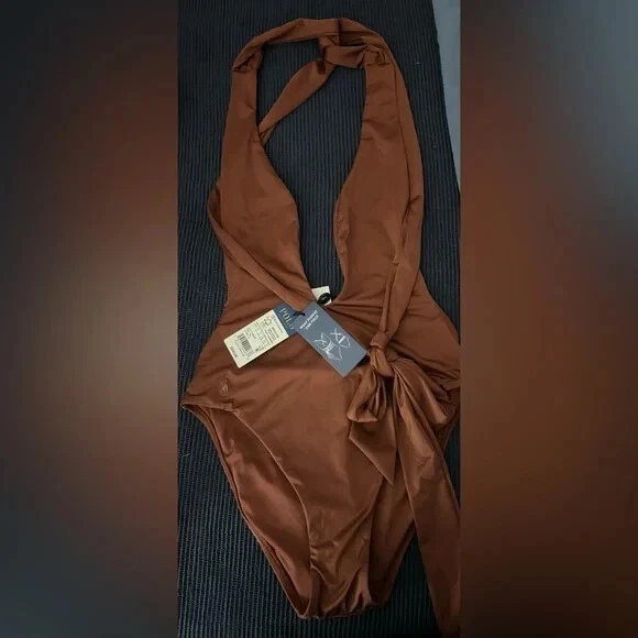 Defined by an alluring plunging neckline, this one-piece swimsuit features a halter silhouette and long straps that can be tied into several different styles . 85% Nylon 15 % Elastane Hand Wash Cold