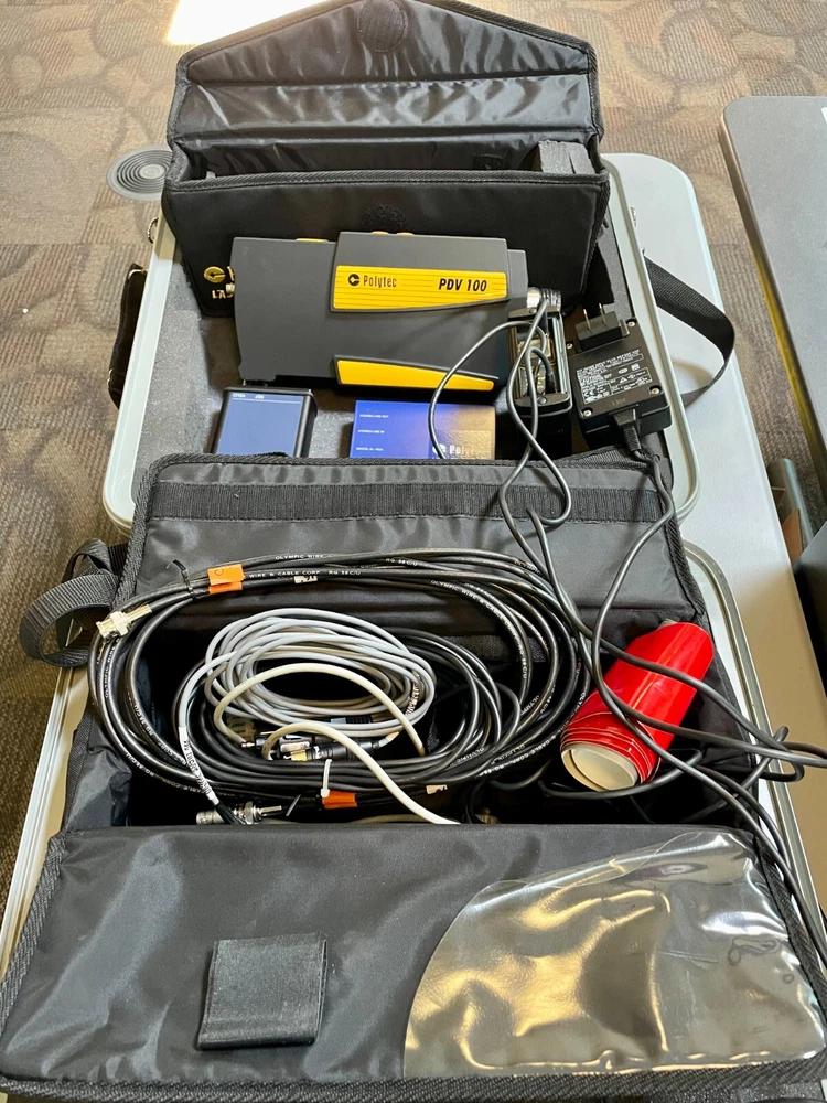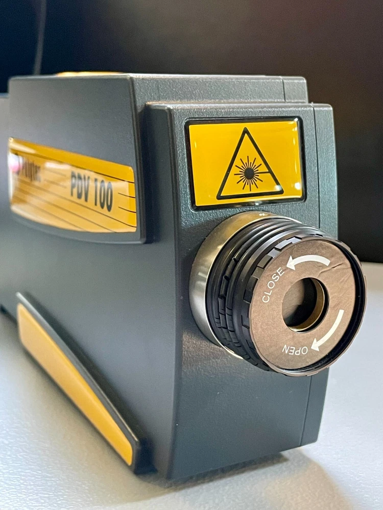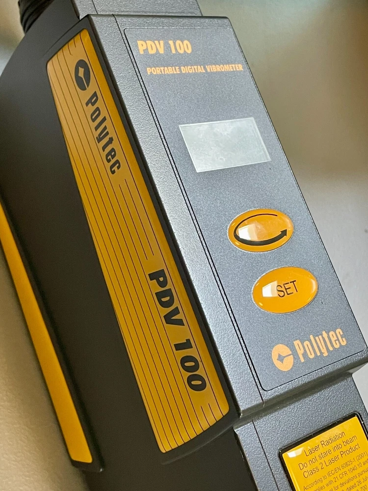 Polytec’s PDV-100 Portable Digital Vibrometer measures surface vibration velocity without contact, utilizing Laser Doppler Vibrometry (LDV) technology Features Non-contact velocity measurement in the frequency range 0 to 22 kHz 3 velocity ranges for highest resolution Digital signal processing Analog and digital signal outputs Variable working distance from 0.1 m up to 30 m Eye-safe visible laser Lightweight, ergonomic and rugged design, hermetic housing Low power consumption (batteries, wide voltage range AC mains adapter) Vibration measurements are made easy with the PDV-100. After focusing the laser beam on the vibrating object the measurement range is set via only two push buttons. An illuminated liquid crystal display shows the selected range, the amount of light returning to the PDV-100, and, if applicable, velocity over-range and low-battery warnings. Selectable high and low pass frequency filters condition the velocity signal to suppress low-frequency background vibrations or unwanted high-frequency signals. Included with PDV-100 are AC/DC power adapter (100–240 V AC, 50/60 Hz) with connecting cable, transportation bag, digital interface (S/P-DIF) cable (Triax / RCA), 1 sheet of reflective tape. PDV-BS battery supply kit with transportation bag. Integrated lithium ion battery set (rechargeable), battery charger (100–240 V AC, 50/60 Hz) cable for operating PDV-100 from a 12 V vehicle Power outlet or cigarette lighter socket