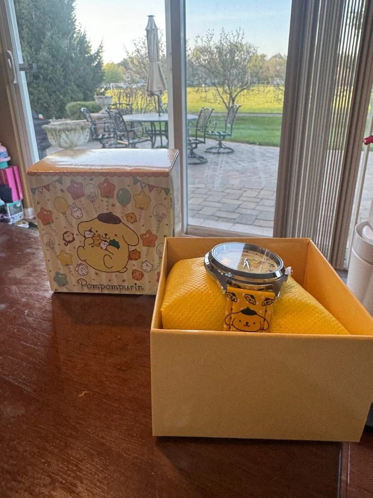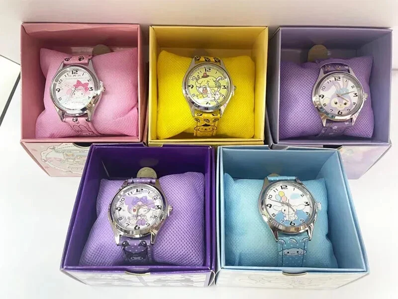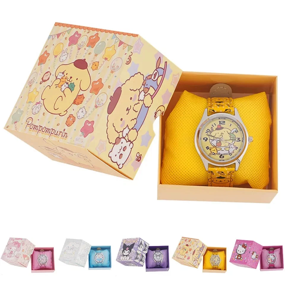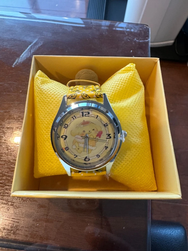 Just in time for spring/summer are these beautiful Kawaii Pompompurin watches that come with a special Pompompurin Gift Box and pillow!! This version, Pompompurin, is a very popular model for collectors of Hello Kitty. This watch is lightweight, with quartz movement, approximately 35mm wide, not including crown, 7mm in thickness and measures approximately 8 inches long in total. This watch is sure to make a wonderful gift for any fan of Pompompurin and is suitable for all ages. The watch itself has a yellow dial and yellow canvas strap with Pompompurin displaying prominently on the dial. The crown is easy to pull in and out to set the time and the quartz movement keeps time well as a functional and very cute "Kawaii" fashion accessory! The watch comes with a battery so just pull the plastic piece from the crown to power the watch and you're all set!! Please carefully review the photos of the watch as we have included both stock photos and photos we have taken of the actual product. These watches are well crafted and the Pompompurin gift box that is included makes a very easy gift and a "Must Have" for any fan of Hello Kitty!! These super cute Pompompurin watches would make a great gift for a loved one or as a gift for birthday parties, holidays and other celebrations. We also sell pink Hello Kitty gift boxes and bags with a different design separately, as you can purchase just the box or the bag or both, so please take a look at my other items we have for sale. We also have Hello Kitty, Kuromi and Cinnamoroll watches of the same model, please check the other items we have for sale. Each watch from the various characters has their own unique designs and colors. Please feel free to look at the other items we have for sale. It would be great to collect them all as they are all unique and very cute and would make a perfect addition to any Hello Kitty collection!! Special function: Fashion accessory Display type: pointer Applicable audience: All ages Style: Cartoon Movement type: quartz Thickness: 8mm Dial diameter: 35mm Crown type: spiral crown Mirror material: ordinary glass mirror Watch buckle style: needle buckle Table buckle material: stainless steel Watch strap material: canvas Dial shape: circular Case material: alloy