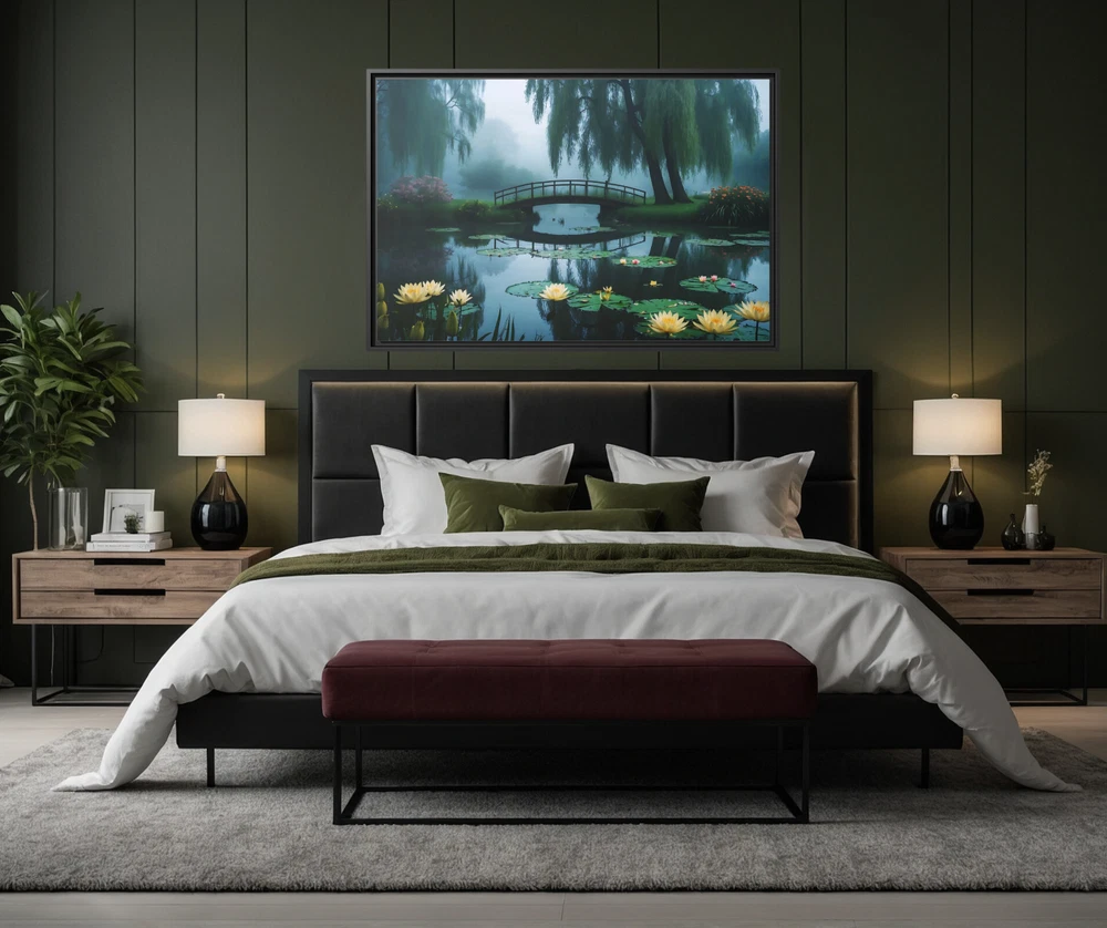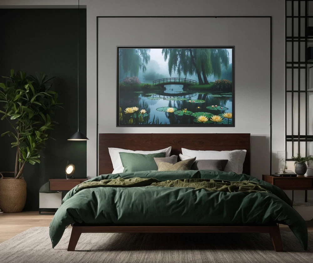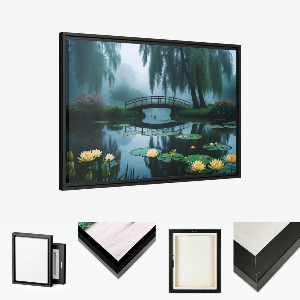 Tranquil Green Oasis: Framed HDR Landscape Canvas Product Description: Transform your space with " Tranquil Green Oasis " a serene green-dominant landscape illustration by Hypnotik Creations. Featuring a tranquil pond surrounded by lush grassy fields, vibrant wildflowers, and majestic weeping willow trees, this moody nature scene captures the essence of peace and harmony. A charming wooden bridge and floating water lilies add a touch of rustic elegance, making this artwork a true escape into the wonders of nature. Expertly printed in HDR on museum-quality cotton-polyester composite canvas, this piece showcases vibrant colors and intricate details enhanced by a proprietary matte finish coating that ensures long-lasting brilliance. Using UL-certified Greenguard Gold latex inks that are non-hazardous, non-toxic, and non-flammable, this artwork is as eco-conscious as it is stunning. The canvas is framed with a 1.25" solid pine wood floating frame available in a sleek black finish. Sustainably sourced and Forest Stewardship Council certified, the frame adds a modern aesthetic while supporting environmentally friendly practices. Ready to hang straight out of the box with pre-attached sawtooth hardware, rubber dots at the base ensure the canvas stays securely in place on your wall. This timeless piece of art is perfect for adding a touch of natural beauty to your living room, bedroom, or office. Please note that slight size variations (tolerance +/- 1/8") may occur due to the production process. Dust and maintain effortlessly with a gentle wipe using a clean, damp cloth. Key Features: Nature-Inspired Design: Features a serene pond surrounded by weeping willows, wildflowers, a wooden bridge, and floating lilies, creating a calming and moody atmosphere. HDR Printing Excellence: Printed on museum-quality cotton-polyester composite canvas with vivid colors and intricate detail, enhanced by a proprietary matte finish coating for durability and brilliance. Eco-Friendly Inks: Produced using UL-certified Greenguard Gold latex inks that are non-toxic, non-hazardous, and non-flammable, ensuring vibrant, safe, and eco-conscious artwork. Sustainably Sourced Frame: 1.25" solid pine wood floating frame available in black, certified by the Forest Stewardship Council for eco-friendliness. Ready to Hang: Equipped with sawtooth hanging hardware for easy installation and rubber dots for stability on your wall. Low Maintenance: Dust-resistant and easy to clean with a gentle wipe using a damp cloth. Slight Size Variations: Due to the handmade production process, size tolerance is +/- 1/8" (3.2 mm). Size Options: 30x20, 36x24 & 48x32. Enhance your interior with this breathtaking " Tranquil Green Oasis " canvas, a timeless celebration of nature that brings tranquility and charm to any space. * Shipping to Alaska, Hawaii, and unincorporated territories of the United States can take additional 7 ? 12 business days, weather permitting.
