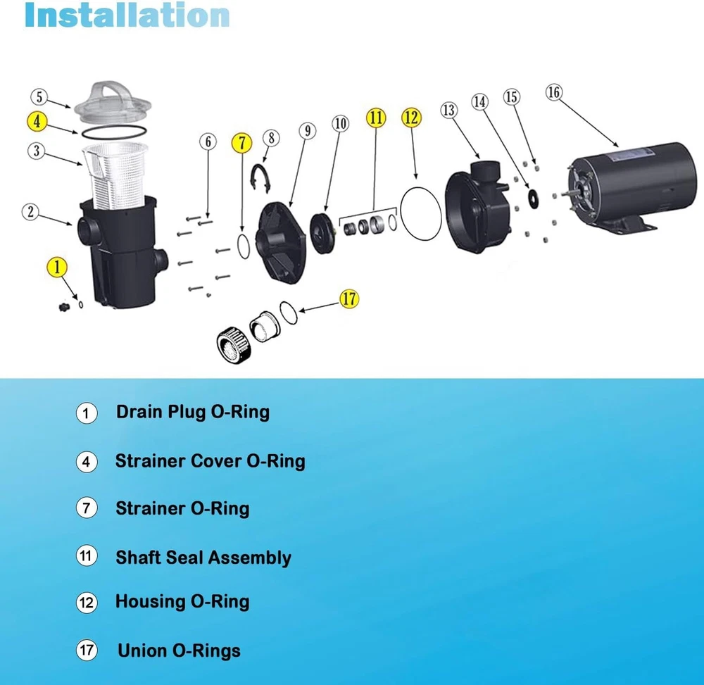 Pool Supply O-Ring Rebuild Seal Kit for Hayward Power-Flo LX SP1580 Series Pump Pump O-Ring Seal Kit for Hayward Power-Flo LX SP1580 Series Pump, Pool Supply O-Ring Rebuild Repair Kit Repair: This kit is a quick and easy way to repair your pool pump and get it back to normal operation. Fitment: For Hayward Power-Flo LX SP1580 Series Pump. Package includes: Housing O-Ring SPX1580Z1, Drain Plug O-Ring, Two Union O-Rings SPX1495Z1, Strainer Cover O-Ring SPX1500P, Strainer O-Ring SPX1500W, Shaft Seal, O-Ring Lube. Installation Tips: Prepare some tools in advance, like small flat-blade screwdriver and skinny needle nose plier for easy replacement of the seal kit. Features: Designed to deliver trouble-free, consistent performance, made from high-quality materials for ultimate durability, manufactured to meet or exceed strict quality requirements. Payment Delivery details Terms of sales Returns Contact us Payment 1. All major credit cards are accepted through our secure payment processor Payoneer. 2. Please make sure your Shipping address is correct before you pay, cause it cannot be changed once the order shipped out. Delivery details 1. We only ship to confirmed ebay addresses. Your ebay address MUST MATCH your Shipping address. 2. Please read the shipment and payment detail carefully before you bid. Terms of sales ★If there are any problems with our products, Please feel free to contact us. We will always here to solve them for you. We should try our best to make a happy easy transaction. ★If you are satisfied with our products and our service, please tell your friend and leave us positive feedback. If you are not satisfied with our products or service, please DO tell us. Returns 100% Satisfaction Guarantee: Your satisfaction is our priority. We strive to give our customers excellent service.All our products support 60-Day money-back guarantee, 12-Month warranty for quality-related issues. Simply return it for your warranty. Contact us Any Questions,Just feel free to contact us on eBay.We will reply you in 1-2 business day.