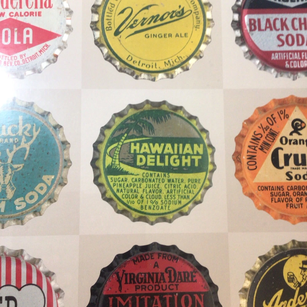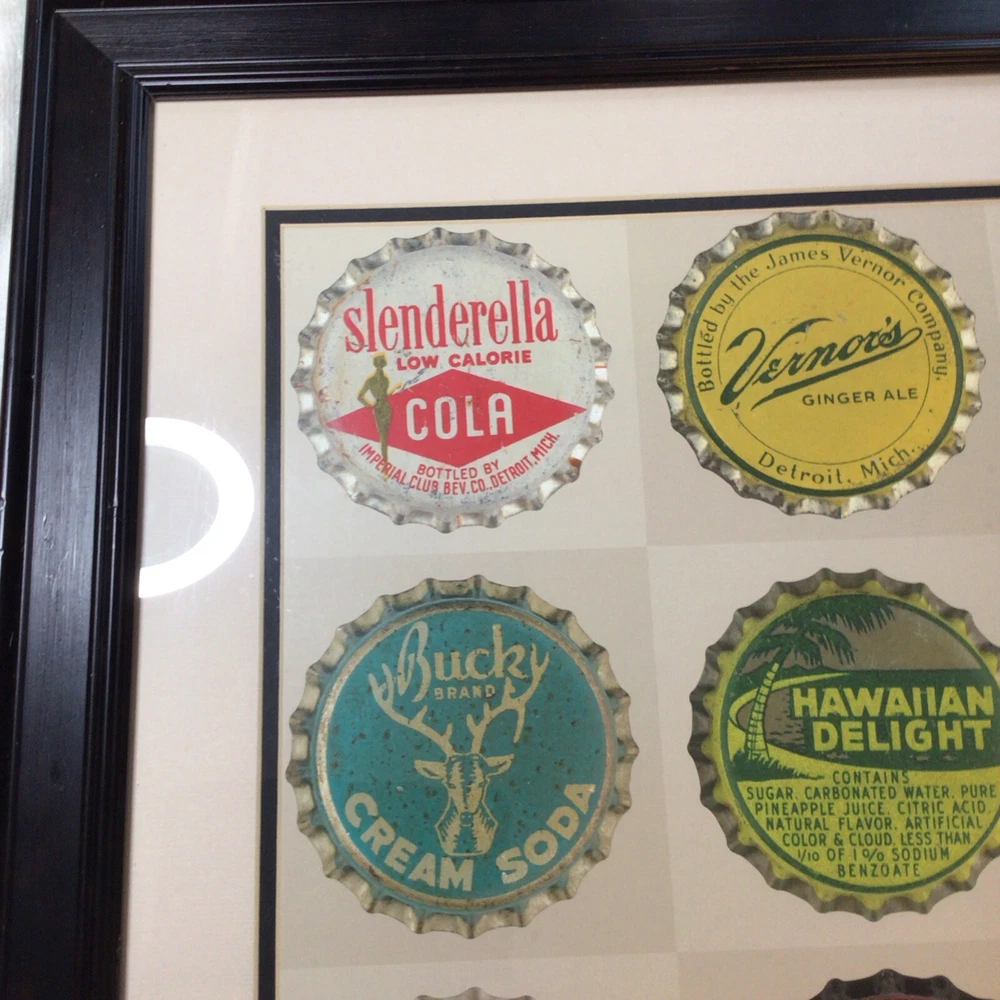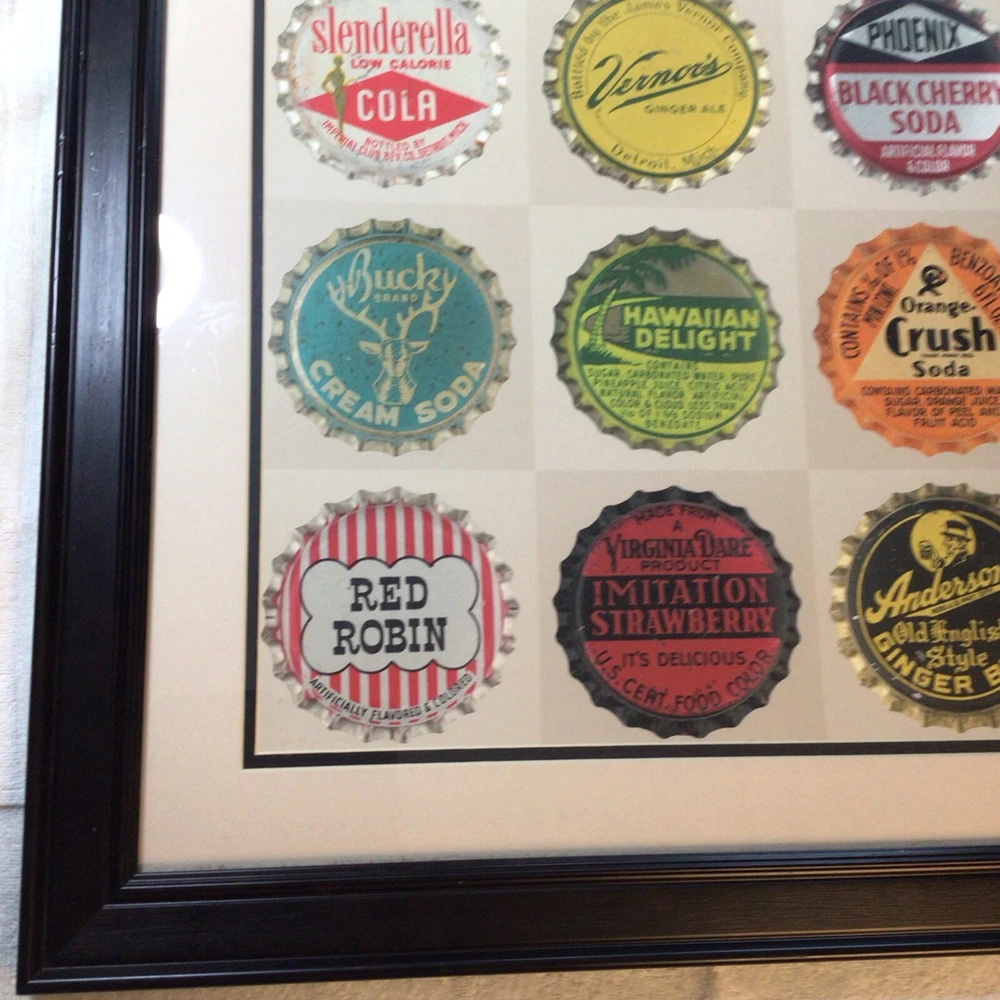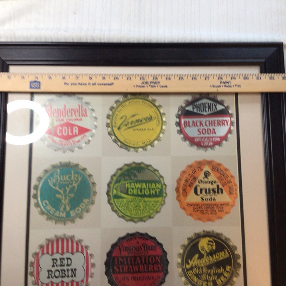 This beautiful giclee print titled "Pop Bottle Tops II" is a stunning piece of art that captures the essence of American culture. The artwork features a colorful depiction of soda bottle caps, which adds a touch of nostalgia to any room. The print is matted and framed, making it ready to display upon arrival. The piece measures 23 inches in both height and length, and is made of high-quality paper. The artwork is perfect for those who love art deco style, Americana, and pop culture. Don't miss your chance to own this unique and captivating piece of art. Nice piece with dark frame. The back has some stains and blemishes but doesn’t affect the print or frame. Please look at the pictures closely, as this is the item that you will receive.