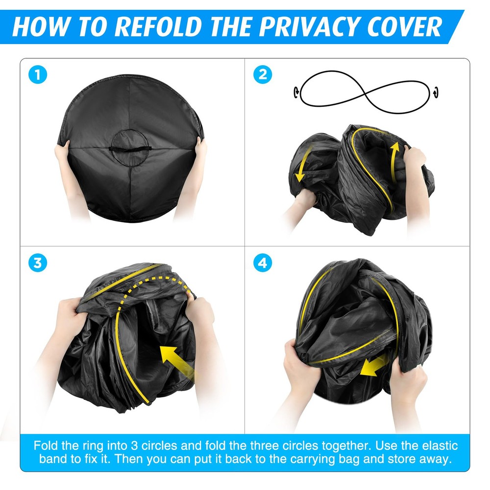 INNOVATIVE DESIGN - The pop-up privacy tent is a hands-free design that rests right on your head with a stabilization pad. And without any hassles of tedious installation – a must-have travel accessory for your next adventure! FAST SETUP – Designed for utmost convenience our instant pop-up tents can be set up instantly and are equally easy to fold back into the included carry bag. Super easy to use. SIMPLE TRANSPORT – Take this pop-up tent along easily by packing it in the included carrying bag and stowing it with other camping supplies. The zippered case creates a compact, lightweight package for simple transport with other camping accessories. PRODUCT DETAILS – Material: 190T Polyester. Dimensions: Fold down: (L) 14.1" x (W) 11.8"; Set up: (Diameter) 36.7" x (High) 51.2".