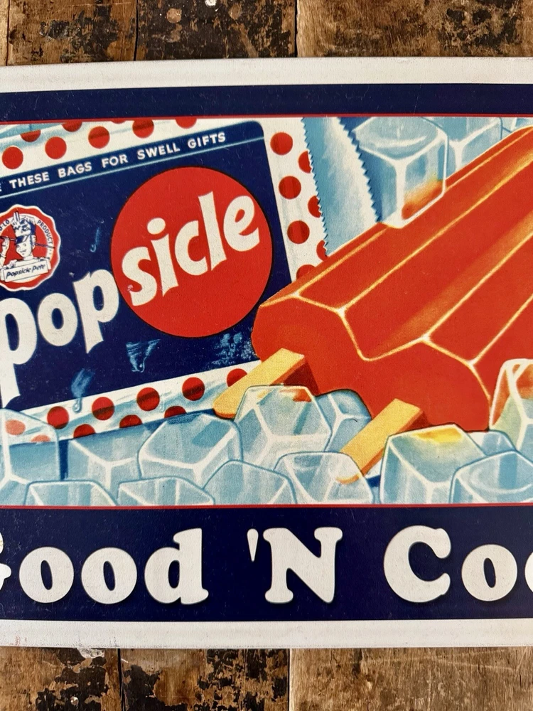 Popsicle Good ‘N Cool Tin Desperate Sign US Made Advertising Popsicle Pete 2002 16”W x 10.5H 2002 Good Humor-Breyers Ice Cream Licensed Item is used and shows signs of age, use and wear Please review photos and ask questions for best condition description
