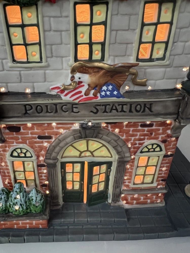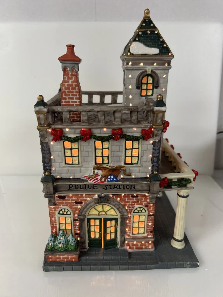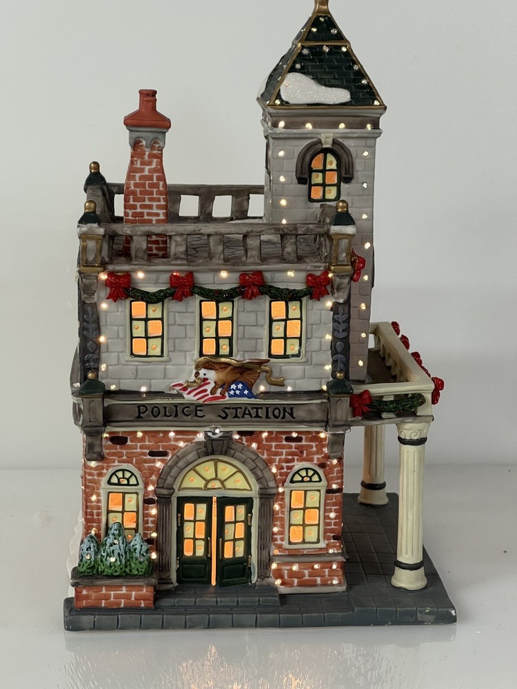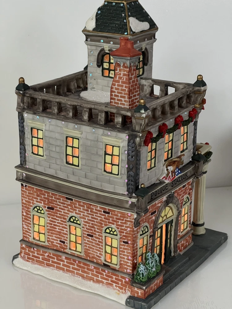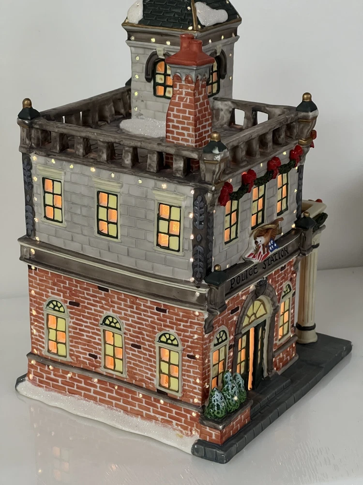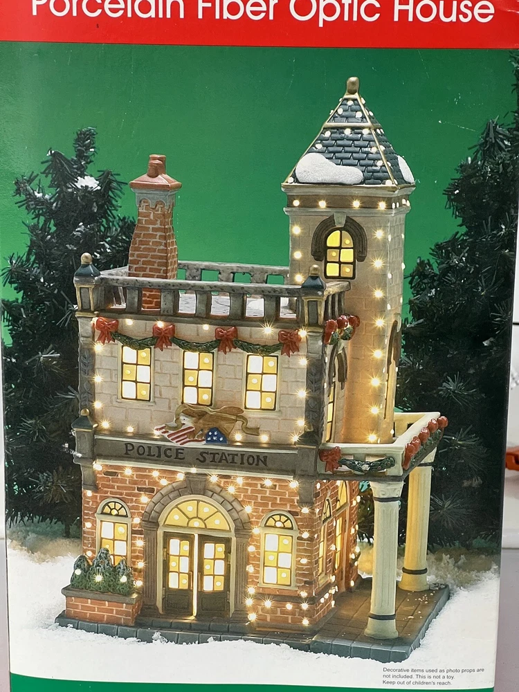This is a medium-sized O’Well Novelty porcelain Christmas village piece from 2005. It features an illuminated, color-changing 3D effect of a whimsical fiber optic police station. The hand-painted, American-style house is suitable for seasonal display in any room. It comes in a box with a 12-volt adapter, part of the Deluxe Fibre Optic House collection. Perfect for collectors of holiday decor. Absolutely perfect pristine condition! Color changing lights , incredible detail , comes with power cord , all original packaging and original box ! Just a beautiful piece to display.
