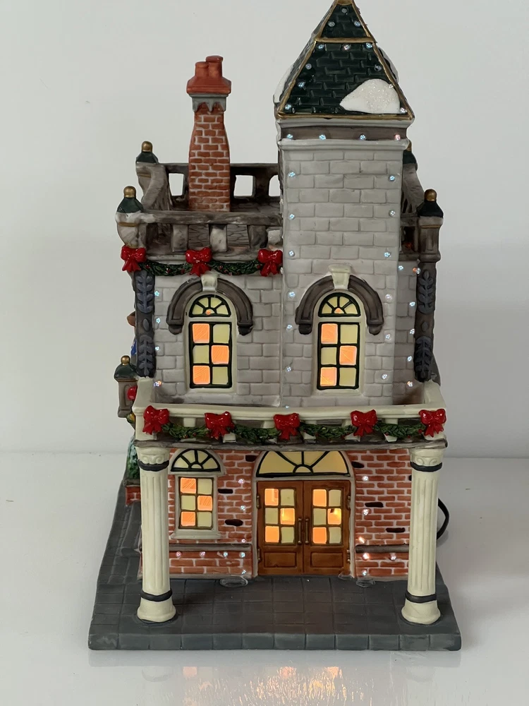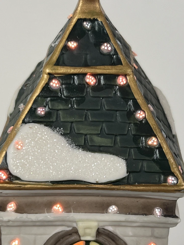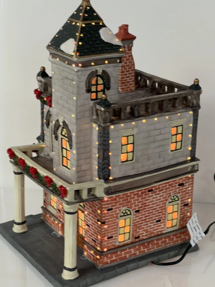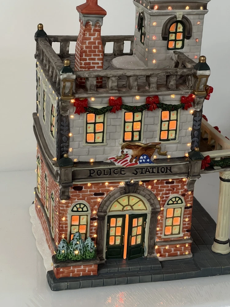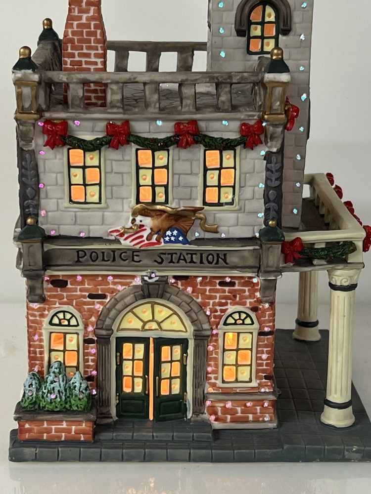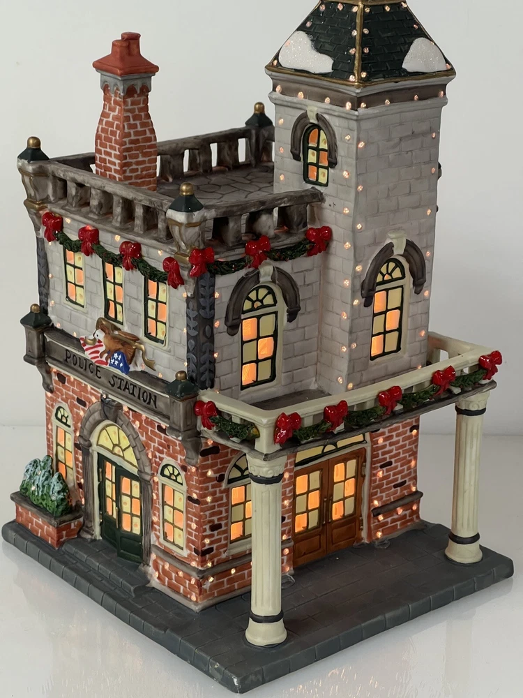 This is a medium-sized O’Well Novelty porcelain Christmas village piece from 2005. It features an illuminated, color-changing 3D effect of a whimsical fiber optic police station. The hand-painted, American-style house is suitable for seasonal display in any room. It comes in a box with a 12-volt adapter, part of the Deluxe Fibre Optic House collection. Perfect for collectors of holiday decor. Absolutely perfect pristine condition! Color changing lights , incredible detail , comes with power cord , all original packaging and original box ! Just a beautiful piece to display.