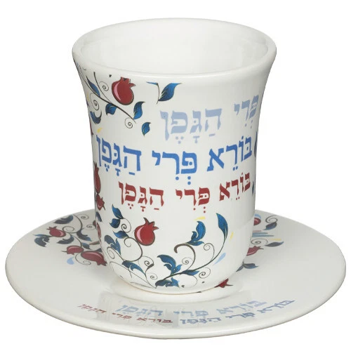 Porcelain Kiddush Cup Wine Goblet with Saucer for Shabbat and Holidays Colorful Pomegranates & Birds (3" x 3 1/2" No Foot) This is a colorful porcelain Kiddush Cup with a matching saucer that goes underneath it. 3 1/2" Tall and 3" Across, with a saucer is that 4" in diameter The Hebrew words beginning the prayer over wine are printed around the cup and the saucer in Hebrew (Boreh Pri Hagafen) The rest of the cup has a colorful design of Red Pomegranates on the vine with pretty Multicolor Birds Imported from Israel -- A beautiful addition to the Shabbat or Holiday table, this cup would also make a wonderful gift for any occasion.