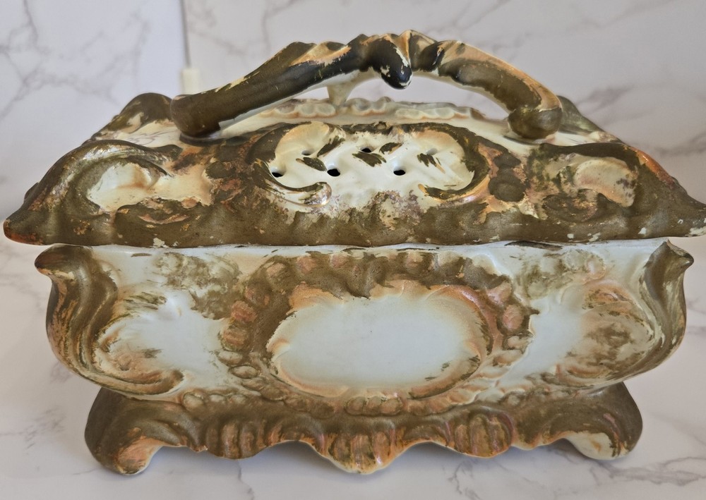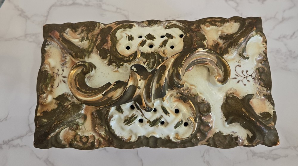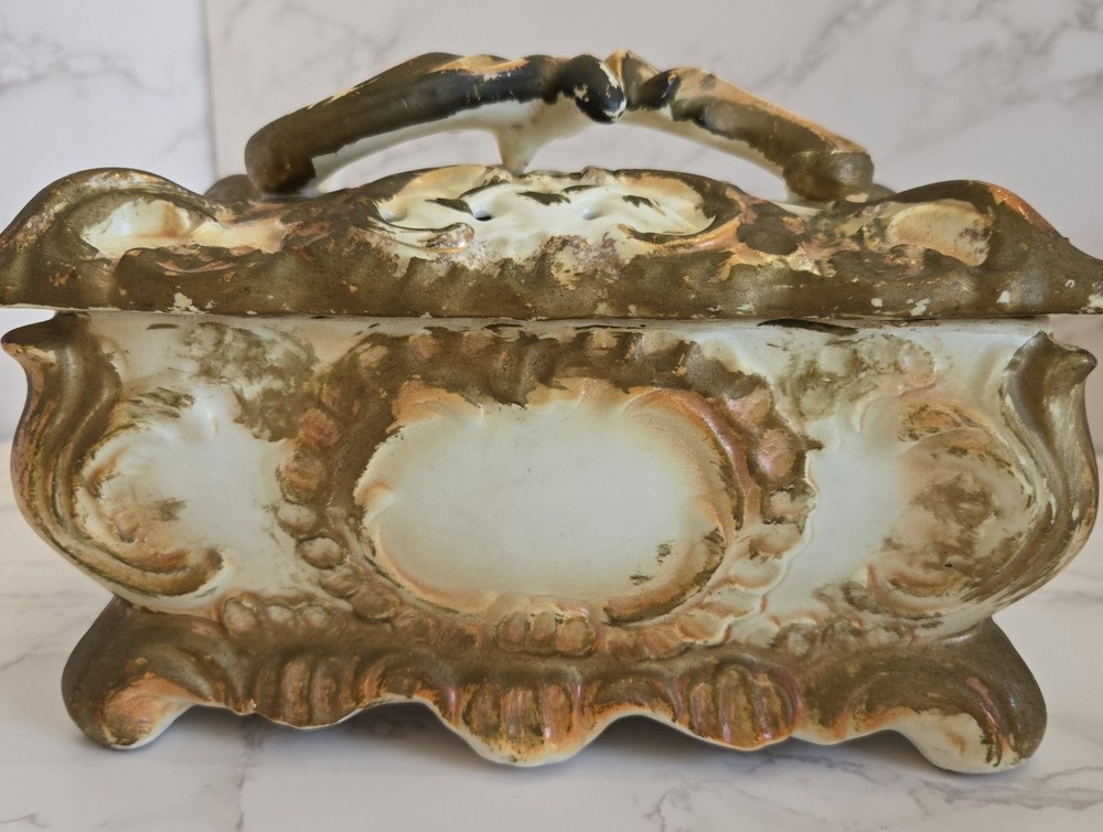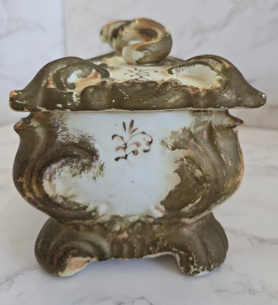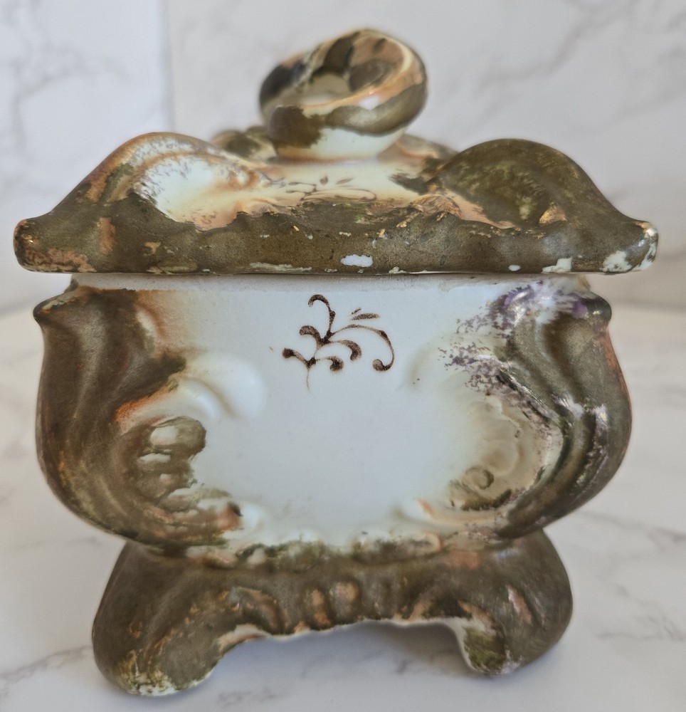 This Porcelain Trinket Box features an Asian-inspired pattern in brown and beige colors, making it suitable for all occasions. The rectangular shape and small size make it perfect for storing trinkets and jewelry. Made of porcelain, this trinket box can be placed in any room of the house. With a matte finish and original design from the late 20th century, this trinket box adds a touch of elegance to any space. Easy to care for with damp cloth cleaning instructions, this collectible piece is suitable for teens, adults, and girls alike. Aged Vintage condition. No cracks or chips. Thank you for viewing.