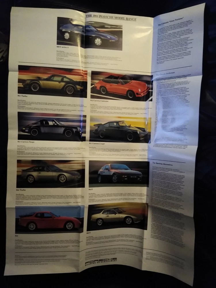 Porsche UK Range Sale Brochure 1988 - Fold Out Poster LeMans 24hr Race Large poster when folded out. Takes up a full 2 seater sofa. Has been folded since new. Does have a few marks on the creases.
