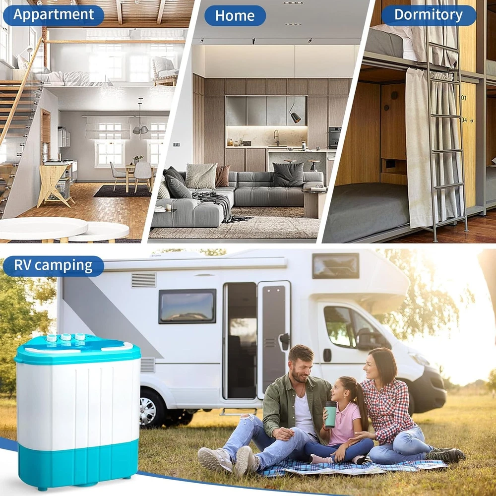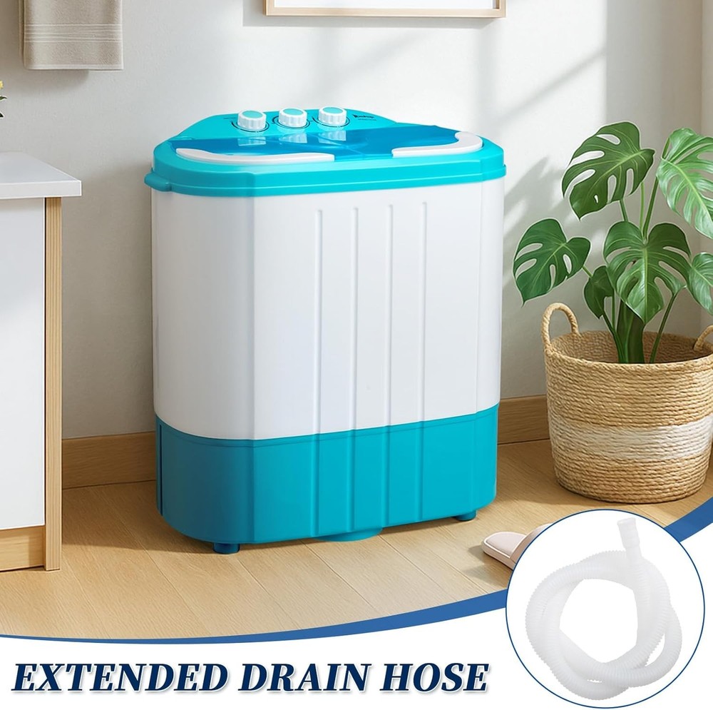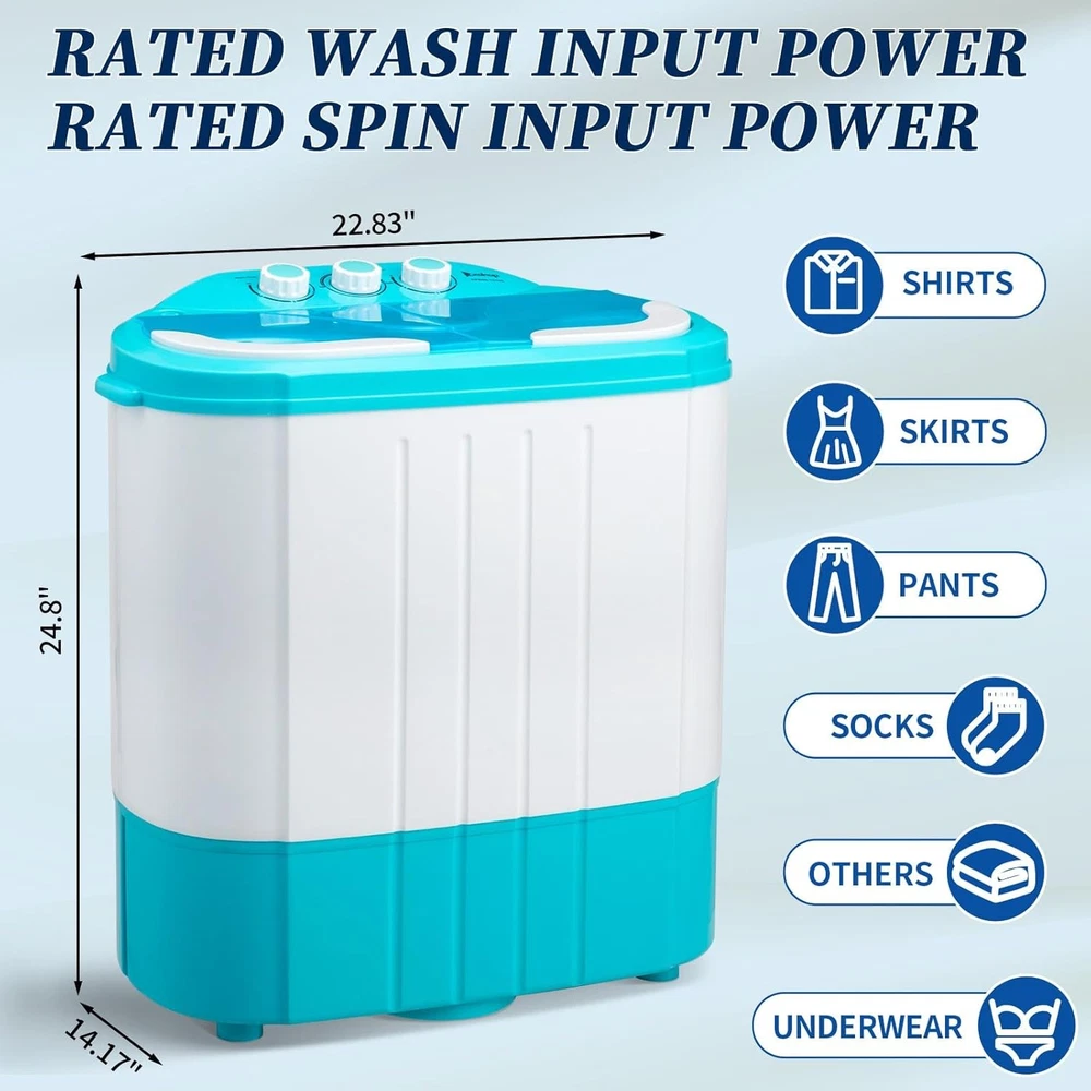 Product Description About this item Twin Tub Design - Portable washer dryer combo is designed with dual-tub dual-function design, which can wash and spin-dry clothes at the same time, providing great convenience, the twin tub design can meet your different needs Easy to Operate - Portable washer offers a simple and easy to understand operation panel, wash timer, wash option/drain option, spin timer for easier use. Allowing you to simply put in your laundry, fill it with water, and set the timer to start the wash Mini & High Power - Washing machine is equipped with a 245-watt high-powered motor and has a wash capacity of 7.7 lbs. The spin dry capacity is 2.2 pounds with a 125 watt high powered motor Compact & Lightweight - Mini washer and dryer combo's space-saving design makes it easy to move around. Ideal for single occupancy homes or homes with limited storage space Durable & Reliable - Washer machine is made of high quality materials and a powerful motor for long lasting performance without a lot of noise during use Portable Washing Machine 10LBS Tips : This washing machine does not come with a drain pump and must rely on gravity to drain.