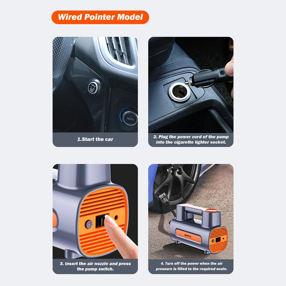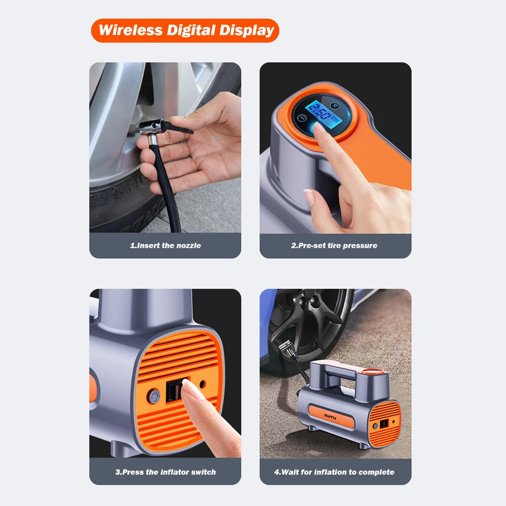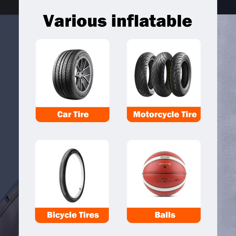 Portable Air Pump for Car Tires Air Compressor Tire Inflator Car Air 120W Product Description Bullet Points: Speedy Inflation: Our car tire inflator takes only 25 seconds to inflate your tires, ensuring speedy recovery during routine maintenance or sudden emergencies. Drive with confidence and convenience knowing you're often prepared for the unexpected. Enhanced User Convenience: With a bright LED light, this car tire inflator provides clear visibility to ensure user safety and convenience during inflation or emergencies at night or in dark environments. Powerful Temperature Control: With advanced temperature control technology, this car tire inflator can automatically adjust the temperature to prevent overheating and ensure safety and durability. Preset Pressure: Our Car Tire Inflator ensures accurate and safe inflation by allowing you to preset the tire pressure value. With the device automatically reaching and maintaining the desired pressure, simplifying operation has never been easier. Efficient Operation: Achieve a smooth and safe inflation process with our car tire inflator's auto-stop feature, which prevents over-inflation and tire damage, providing a hassle-free user experience. Our Portable Air Compressor provides quick inflation with advanced temperature control technology and a preset tire pressure feature. Equipped with a bright LED light, you can inflate your tires anytime, anywhere. Experience an efficient and safe user experience with our reliable Tire Inflator. Specification: Product name: Car Air Pump Product size: about 21x14x9cm/8.27x5.51x3.54 inches Power: 120W Air flow: 35L/min Replenishing time: about 25 seconds Applicable scenarios: balls, bicycles, motorcycles, car tires, etc. type: A-lined pointer model B-with wired digital display model C-wireless pointer model D-wireless digital display model Instructions for use: Wireless Model 1. Check whether the charge is sufficient 2. Turn on the switch 3. When the rechargeable battery USB displays red, it means it is charging normally, and green means it is fully charged. 4. Charging time is about 3-4 hours to fully charge, and it can be used continuously for about 20-30 minutes when fully charged. Wired Model 1. Start the car 2. Directly plug into the DC12V lighter power supply in the car 3. Turn on the product switch to inflate your car tires Precautions: 1. Do not expose it to direct sunlight or use it in places with high temperature and high pressure. 2. Do not use highly volatile detergents to wipe the body. 3. This product is a vehicle tool. It is prohibited for children to use it alone to avoid danger. 4. Under normal conditions, it can usually be used for half an hour and has no impact on your car. 5. After using this product, please turn off the switch. 6. In order to make the air pump more effective, please pause for about 10 minutes before turning it on. 7. When repairing this product, you should follow the instructions. 8. This product is not a toy. Please do not let children play alone to avoid danger. Packing List: Wired version: Host x1 Air nozzle x1 Chinese and English manual x1 Chinese and English color box x1 OR Wireless model: Host x1 Air nozzle x1 Chinese and English manual x1 USB charging cable x1 Chinese and English color box x1 Note: Due to different lighting and screen settings, the item color may be slightly different from the picture. Due to different manual measurements, please allow a 1-2cm difference in size. Payment 1.PayPal is a preferred Payment method. 2.You can make a Credit payment via Paypal.Paypal will let you use MasterCard,Visa to pay. 3.Payment should be completed within 3 days after auction closed, or unpaid dispute will be filed for an closing auction.An unpaid case will be filled after 4 days. Delivery details 1. We ship to many countries. 2. Delivery Time: Ship from China via Speedpak to US (takes 8-12 days) Ship from China via others shipping method to other countries (takes 15-60 days) 3. If you want to choose another address, please leave us a message on ebay.Please check your shipping address carefully before checkout,it can't be changed if order completed. Seriously promise:Refund or resend will be offered if item still not arrive in 7-10 business days. Just send us an email,we will give you a satisfied solution as soon as possible. Return policy 1.All item comes with Basic 3 Months Sellers Warranty, if item defective in 3 months,We will offer replacement without extra charger (including shipping fee) After we receive the defective item. If item Defective after 3 Month, Buyers can still send it back, We will contact suppliers or Manufactory for Warranty. Buyers Might Need pay the Shipping fee For resend the replaced item. 2.If item DOA(Dead of Arrival), Buyers can return it in 30 Days, we will replace it with new item after we receive DOA item. Please Contact us Before you sent the item back. 3.All item can be returned for exchange only. The buyer has responsibility for all return shipping including DOA or defective return. About Feedback When you receive the item and satisfied with the product, please leave positive feedback and 5 scores DSR. We will leave a 5 Scores DSR feedback for you. If, for any reason you are not satisfied with your purchase, please contact via Ebay Message and we will do our best to resolve it. Please don't leave neutral or negative feedback without any communition with .