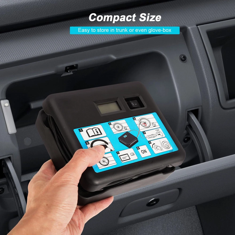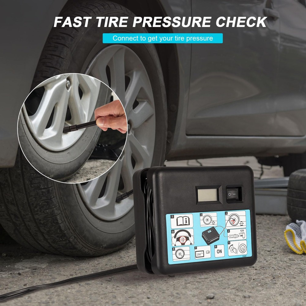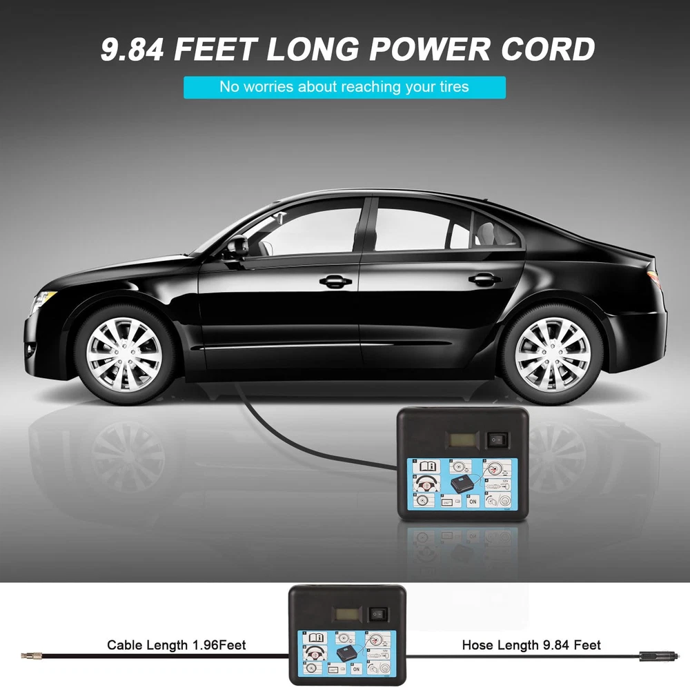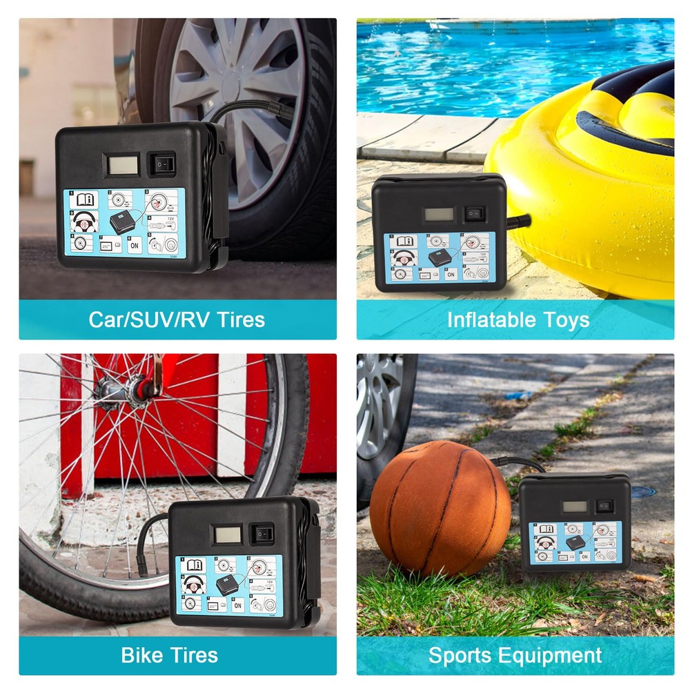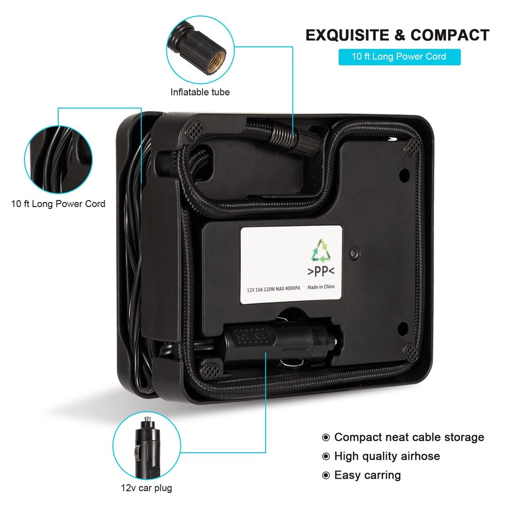 【7 Min Fast Inflation & Easy Operation 】The air tire inflation pump with compact size can inflate 0-680KPA to standard automobile tires in 7 minutes, Just connect the power and press the on/off switch, then the tire inflation pump will start to do all the work. 【Digital Display & Low Noise Design】: This tire inflator is equipped with a large high-precision and high-brightness display to help you check the tire pressure and preset the tire pressure values. The tire inflator of low noise motor adopts special motor technology to realize low noise. 【Wide Application Tire Inflator】Portable compressor can inflate the vehicle tires of cars, motorcycle and bicycles by different nozzle. And inflate balls/ swimming ring/ air pillows/ cushions and mattresses for outdoor activities with accessories nozzles , more energy saving and oil saving 15% at work. 【Ultra-long Power cord & Compact】: The 2ft air hose gives easy access to the front and rear tires, saving you time and energy. The compressor’s compact size allows it to be easily stored anywhere in a vehicle. Even though it's compact, the air compressor delivers fast inflation. 【100% Satisfaction】: This is a great tool to take along with your driving tours, use it anytime you need. If you have any problems when using our products, you can us and we will help you solve all the problems. We will do our best to help you. GET 100% SATISFACTION.
