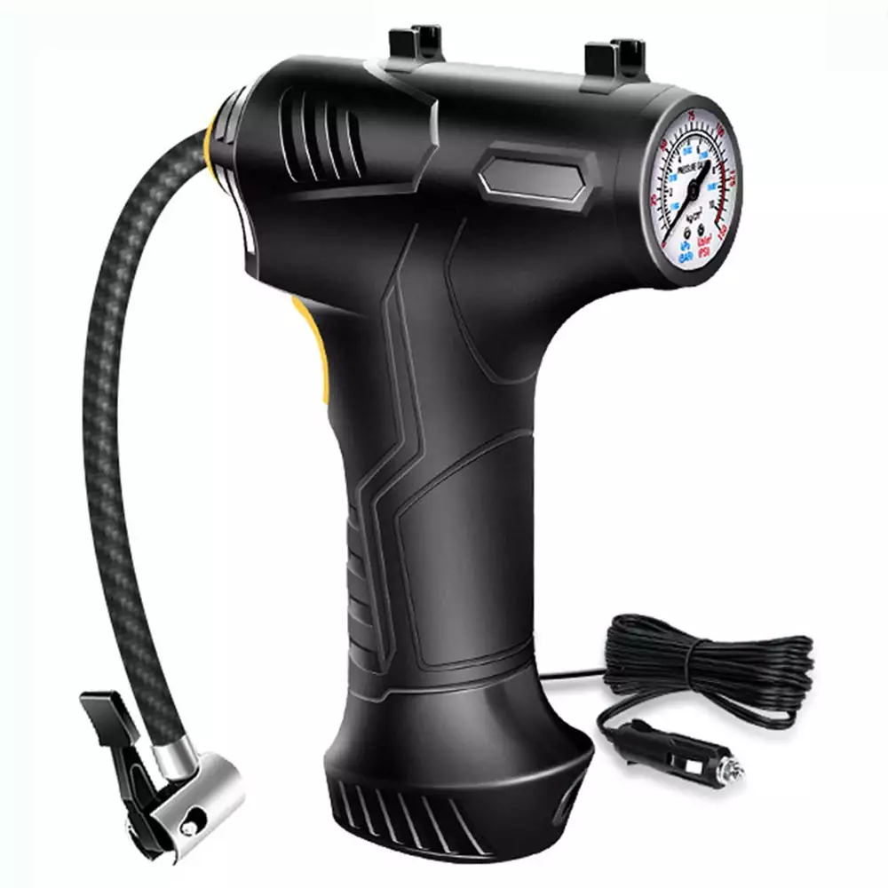 Portable Air Compressor Quick Rechargeable Battery 3 Nozzles Cars Motorcycles Features: ADVANCED ACCURACY: This tire inflator is made of good material, it can inflate car tires up to 25 liters per minute, and it can inflate 195/55/R15 car tires from 0psi to 35psi in 10 minutes.Please note that after 10~15 minutes of continuous use, please allow the tire inflator to cool down before continuing to use it. METAL CYLINDER: The inflator pump is designed with metal cylinder and equipped with permanent magnet motor, which can fully guarantee the quality and performance during use. EXTRA LONG POWER CORD: Powered by car lighter, equipped with 9.8 feet long power cord, it can inflate any tires in your car.1.64 feet inflatable hose is enough for daily use. PRODUCT HIGHLIGHTS: Handle style design, easy to grip. Compact size makes it easy to carry. Features an integrated LED flashlight for emergency use. Wide range of applications: Includes 3 nozzles . Inflates any tire on cars, SUVs, motorcycles and bicycles; included accessories allow for quick balls, cushions, balloons and mattresses. Note: This pump is not suitable for high pressure or high volume applications such as swimming pools and inflatable canoes. Product Description: Color: Black Gross Weight: 498g/1.10lb Product Size: 20.5*14.2*5.4cm/8.07*5.59*2.13in Package size: 21.8*17.2*6.2cm/8.58*6.77*2.44in Product Contains: 1x Tire Inflator 3x inflator nozzle LCD screen: There is a power display, preset the value you want, and the air compressor will automatically shut down when the value is reached. The backlit LCD display will show the desired tire pressure value and the current tire pressure. Portable Design: This portable tire compressor takes up very little space. Even small vehicles do not take up space in the car. Design of Led Lights: Bright LEDs allow you to get work done even in the dark, allowing you to easily deal with various emergencies. Scope of Application: The maximum inflation pressure is 150Psi, it is suitable for all kinds of inflatable toys, balls, and also suitable for bicycles, motorcycles and small and medium-sized cars (including SUVs). Package Contents: 1*12V Air Inflator; 3 * Different Nozzles.