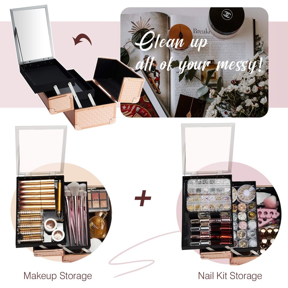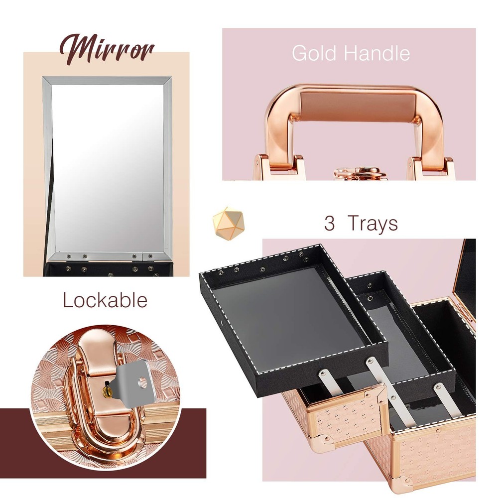 Features: Beauty Rose Gold with the specially pattern aluminum to match with the stereoscopic style surface. In case of travelling, the large handle with soft padding makes it a comfort. Cantilever trays build strong and versatile organizing space. Flexible structure to use at its most space but to remain compact when not in use. Specifications: Material: Grade-A Aluminum Size: 9.44 inch x 6.69 inch x 7 inch. (L x W x H). Color: Rose Gold Package contents: 1 x Rose Gold Makeup Box Note: Makeup brushes and other cosmetic accessories are not included, only for reference. Rose Gold Makeup Box: Makeup box measures 9.44 x 6.69 x 7 inches, making it an ideal size for travel. Made from high-quality materials, it combines sturdy ABS aluminum with metal-reinforced corners for excellent durability. Despite its strong construction, the box is lightweight and easy to carry. Its waterproof rose gold surface not only looks stylish and eye-catching but also protects your makeup from moisture and other outdoor elements. Makeup Train Case with Mirror: This makeup train case features an extendable cantilever 2-tier tray design that provides ample space for organizing your cosmetics efficiently. In addition, it includes a convenient mirror attached to the top tray, allowing you to view all your items at once. This thoughtful design enables you to access your makeup easily and speeds up your dressing routine, making the process quicker and much more straightforward. Makeup Case Easy and Convenient Cleaning: The tray bottom and case bottom are covered with stainproof plastic films, making cleaning quick and simple. These films prevent spills from soaking in and protect against scratches from everyday use. If your lipstick stains the trays, simply wipe the area gently with a damp cloth. After cleaning, the trays will look fresh and spotless, just like new. This smart design makes keeping your trays clean effortless, saving you time and effort. Portable & Lockable Makeup Organizer: This portable makeup organizer is designed for convenience and security. Its compact size makes it easy to carry, perfect for travel or moving your cosmetics. A comfortable, non-slip handle ensures a secure grip even when fully loaded. The sturdy lockable mechanism with key provides added privacy and protection, keeping your makeup safe from unauthorized access. Ideal for travel or shared spaces, this case offers peace of mind and reliable security for your personal beauty items. For Your Beloved: This stylish makeup case is the perfect way to keep her vanity tidy while adding a touch of sophistication. It’s more than just a storage solution—it’s a present that holds both makeup and memories. Ideal for Valentine’s Day, Christmas, birthdays, or any occasion, this practical and heartfelt present will be loved by those you care about, bringing happiness and neatness.