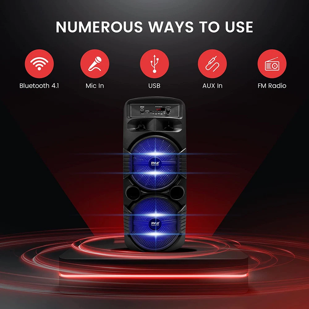 600 WATT POWER: This high powered wireless karaoke PA portable bluetooth speaker is equipped with dual 8" subwoofer and 1" tweeter with 600 watt peak power / 300W RMS at 2.6 ohm for full range stereo sound reproduction and impressive bass response.Waterproof : No COMPATIBLE WITH BLUETOOTH: The box type loud bluetooth speaker system is compatible with bluetooth for wireless audio streaming and works with devices like iPhone, android mobile phone, iPad, tablet, PC. Ideal for personal indoor home and outdoor use 3 INPUTS: Pyle bluetooth speaker karaoke PA system is equipped with a USB flash drive reader so it can serve as an MP3 player, a 3.5mm AUX input for connecting external devices & a 1/4” mic / guitar input. Equipped with FM radio with digital LED display FLASHING DJ LIGHTS: The bluetooth party speaker with lights features multi-color flashing disco LED party lights. True wireless stereo system adds life to any occasion, great for patio parties & night gatherings when colorful presence is noticeable RECHARGEABLE BATTERY: This Pyle PA speaker is great for karaoke, stage performances & crowd control. It is fully portable, thanks to its built-in rechargeable battery with level indicator lights, and extending carry handle so you can take it anywhere Features: - True Wireless Stereo System - Portable Speaker System - High-Powered PA Loud Speaker Style - Bluetooth Wireless Music Streaming Ability - Multi-Color Flashing LED Party Lights - Built-in Rechargeable Battery - FM Radio with Digital LED Display - Connect & Stream Audio from External Devices - Aux (3.5mm) Input Connector Jack - USB Flash Memory Reader - 6.5mm Microphone input - Battery Level LED Indicator Lights - Rugged & Durable Molded Cabinet Design - Convenient Extendable Carry Handle - For Indoor / Outdoor Use Bluetooth Wireless Streaming: - Built-in Bluetooth for Wireless Music Streaming - Simple & Hassle-Free Pairing - Works with All of Today’s Latest Devices - Smartphones, Tablets, Laptops, Computers, etc. - Bluetooth Version: 4.1 - Bluetooth Network Name: ‘PYLEUSA’ - Wireless Range: Up to 32’ ft. What's in the Box: - PA Speaker System - Remote Control - Power Adapter Technical Specs: - Material: Polypropylene (PP) - Max Power Output: 600 Watt Max - Sound System: 8’’ -inch Subwoofer x2 + 1” Tweeter - Impedance: 2.6 Ohm - USB Interface Type: 2.0 - Digital Audio File Support: MP3 - Maximum USB Flash Support: 32GB - Remote Control Battery Operated, 1 Piece Button Cell Battery CR-2025 (Included) - Battery Life: Up to 3 Hours (Charge Time: Approx. 4.5 Hours) - Rechargeable Battery: 3.7V, 2400mAh – 8.88 Wh - Power Supply: 120/240V, Switchable (5V/2A Power Adapter) - Dimensions (L x W x H): 9.1’’ x 8.7’’ x 23.2’’ -inches.