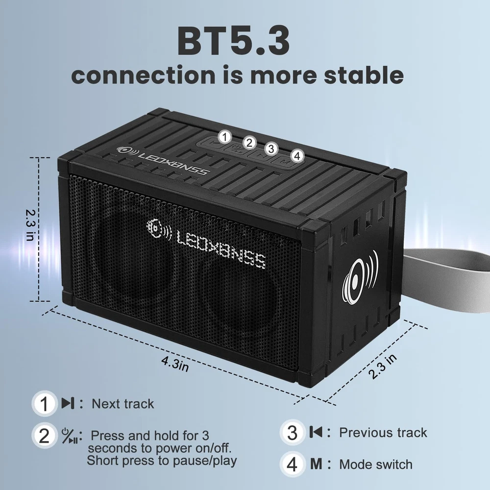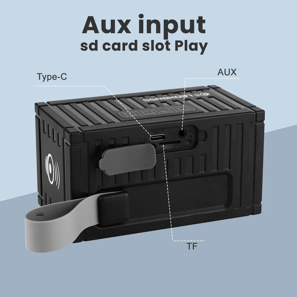 Unique design :Mini Bluetooth speaker wireless container-style design, (4.33 x 2.36 x 2.56 inches) is portable and convenient. The acoustically matched internal cavity and diaphragm deliver clear sound.blue tooth speaker wireless for iphone Comes with a carabiner, ideal for outdoor, beach, home, office, and party use The link is more stable:Waterproof speakers bluetooth wireless adopt Bluetooth 5.3 chip version to ensure fast pairing and stable connection, with wider compatibility for mobile phones. Bluetooth speaker with aux input supports multiple music formats AUX and TF card playback: travel Bluetooth speaker features TF card local playback and a 3.5mm AUX input. Enjoy a unique listening experience with small desktop speakers, as it connects via Bluetooth to your phone, tablet, or computer for playing your favorite music and movies Durable and waterproof: altavoz Bluetooth portátil is made of abrasion-resistant ABS material and features a built-in rechargeable battery Super battery life. This beach speaker waterproof sandproof, capable of withstanding light mist and splashes but should not be submerged partially or fully in water High-fidelity sound: The rechargeable bluetooth speaker utilizes an acoustic internal structure and a 10W amplifier chip paired with speakers to output high-quality lossless music. The mini bluetooth speakers wireless provide even, balanced sound, perfect for listening to music and watching movies on your phone without distortion Broadly Applicable: Portable cell phone & mp3 player speakers & audio docks are suitable for children, adults, and people of all genders. The compact Bluetooth speaker is especially ideal for those who appreciate cube-shaped designs and shipping container models. It makes a perfect birthday gift or Christmas present