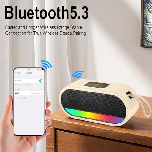 Bluetooth 5.3 & Extended Bluetooth Connectivity: Equipped with Bluetooth 5.3 technology, this bluetooth speaker has better, stable signal and high transmission rate to ensure reliability. The built-in microphone provides high quality and convenient hands-free calls. The portable speaker can automatically reconnect to the last device used. It can not only connect laptop, phone, MP3, iPhone, iPad, but also personal computer,TV . Exquisite Silicone Leather with RGB colorgul light: Our waterproof speaker offers a dazzling array of eye-catching color choices, bringing joy and delight to your life. Portable speaker bluetooth increase colored light modes and make the lights follow the music. Easy to switch with a light control button. As the music plays, the colors dance in sync, providing a more dynamic audiovisual experience for you to enjoy. 360° Hi-Fi Stereo Sound and Punchy Bass:This wireless speaker deliver excellent stereo sound with 24W total output power, which allows for unique enhanced bass. It handles crisp treble and mid frequencies excellently without noticeable crackle at max volume. Mini speaker processing technology delivers higher volume and clearer sound, increasing volume by 32% while maintaining quality, even in the background of a shower or outside noise, amazing stereo sound can still fill your ears. Long Battery Life: Portable bluetooth speaker comes with a Type-C charging cable and can be charged via USB. With a 2200mAh high-capacity rechargeable battery, it provide a full 10 hours of music, or 1000 hours on standby, with fast 4-hour charging.The lights can be TURN OFF and that the actual playtime can vary depending on volume level, audio content, and usage.This wireless bluetooth speaker makes a perfect gift for men, women, and friends. Tough durable& IPX6 Waterproof Speaker: The top of the small speaker bluetooth is made of silicone, Type-C charging port with indicator light for easy use. ABS plastic shell-Anti-dust and anti-fingerprint. Engineered to handle rough use and adverse weather conditions, this bluetooth speaker portable features a durable design and an IPX6 rating for protection against water splashes and spills. It's an ideal choice for outdoor events, and is perfect for use at parties, at the pool, on the beach, while camping or hiking, and more.