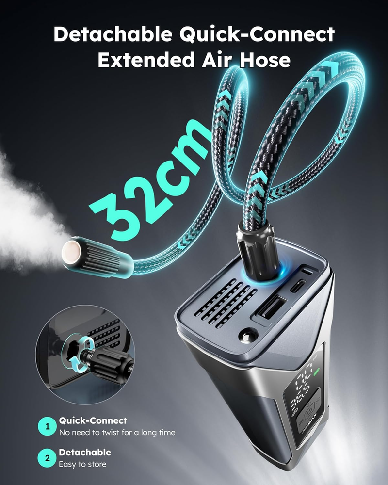 This portable air compressor is a lifesaver! It inflates tires super fast with its powerful 26L/min speed and goes up to 160psi. The built-in pressure gauge ensures accuracy, and the 7500mAh power bank is a handy bonus. Perfect for cars, bikes, and even sports gear—plus, the emergency LED light adds extra convenience. Highly recommend!