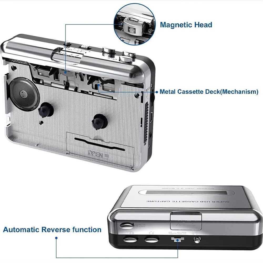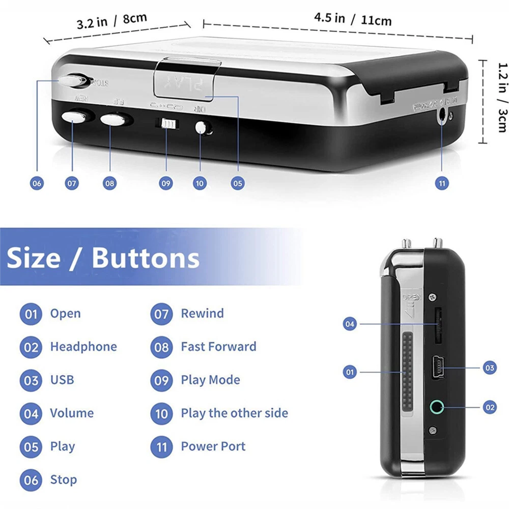 Product Features: Brand new and high quality guaranteed! Converts tape to MP3, quickly converts old cassettes to MP3 format via a USB cable. Can be used as . Better than just a recorder, it works perfectly as an old school, vintage with any standard headphones. Works perfectly with any standard 3.5mm AUX jack, you can use headphones, earbuds, or an audio port to your car speakers. Clear sound quality. By transferring your cassettes to MP3s in a quiet room, you can enjoy crystal Clear sound quality with even the oldest bands. Portable design fits in virtually any bag and enables you to play and transfer anywhere. Plug and Play USB device, no drivers required. Powered Operation: Battery or USB. Comes with tape converter software to guide you through transfer. Easy to use. How To Use Connect audio capture USB connector into your computers USB2.0 port and activate the software. Put a cassette into the cassette player. Push the Start button to transfer the tape. Click the Record button of the Software to record and click the Stop button when finished. Save as MP3 in PC. Buttons: Eject: slide to open the cassette holder. Volume: adjust the volume of headphones and USB connection. Headphones: connect headphone here. USB Connection: connect USB cable. Play: press to play tape. Stop: press to stop tape. FF/REW: press to fast forward or rewind tape. DIR: selects the direction of tape playback. Play Mode: selects what the tape does when it reaches the end of a side. Product Specification: Type:USB Cassette Capture Function:convert tapes and cassettes to MP3 Compatible PC OS:all except for Mac 10.5 or higher Consumed Power:≤1.5W Dimension:4.5*3.2*1.2in(110*80*30mm) Weight:5.18oz(148g) USB Cable Lenght:31.49in (800mm) Audio Cable Length:41.34in (1050mm) Package included: 1 x USB Cassette Capture 1 x Headphones 1 x USB cable 1 x Software CD 1 x User Manual