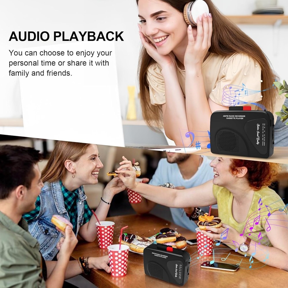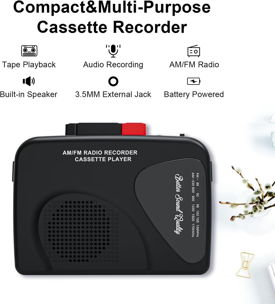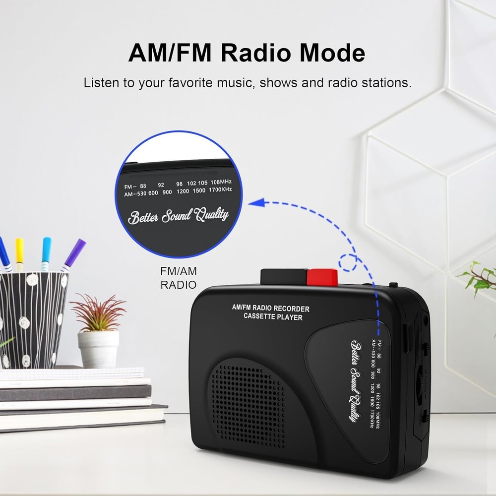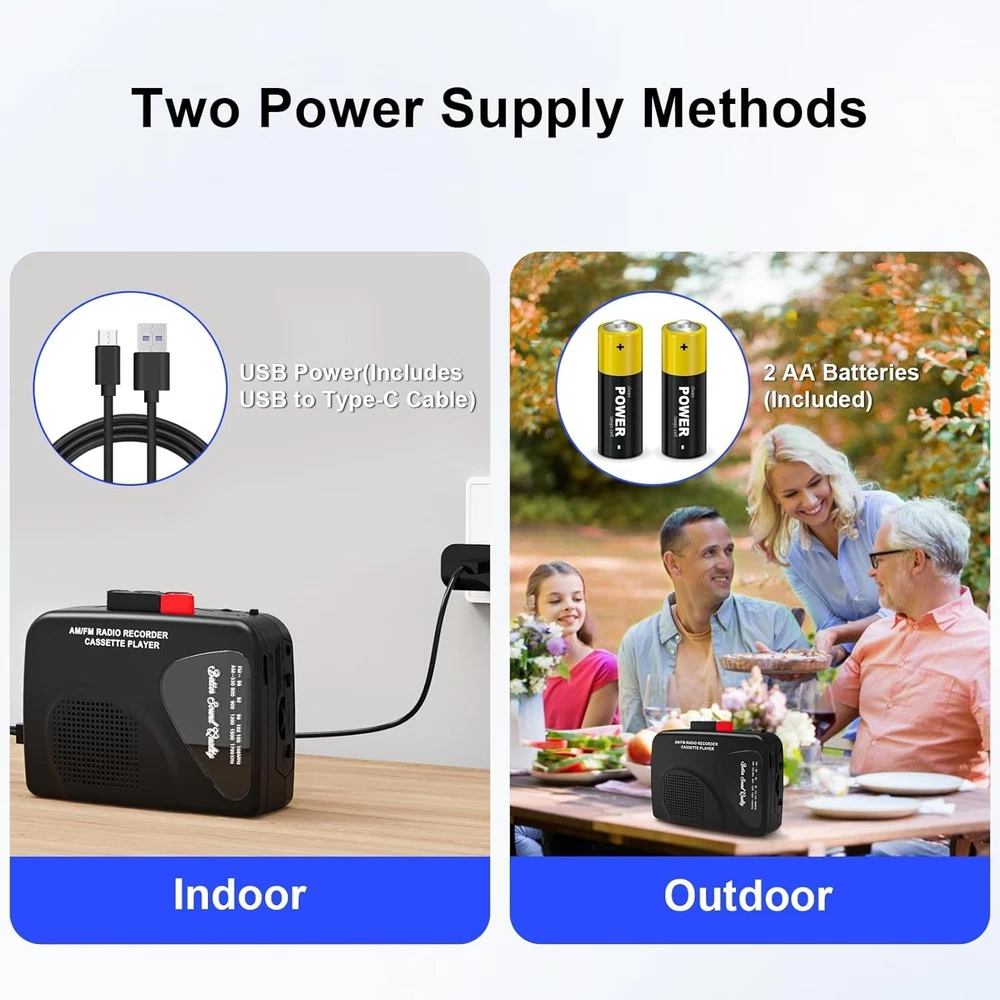 Multipurpose Walkman Player: This cassette recorder can not only play memories recorded on your old tapes, but can also be used as AM/FM FM to listen to your favorite radio stations. Or as a portable recorder to record the beauty of the moment. This cassette player is lightweight, compact, and full-featured to meet all your needs. Multifunctional Recorder: This cassette player has a recording function. Turn on the voice activation system VAS and then record. You can record AM/FM audio broadcasts to cassettes, as well as external sounds to tapes. Help you capture the beauty of the moment at any time, whether you are recording a mixtape, study course, lecture, or seminar. AM/FM Radio Station: This portable radio has a built-in antenna, radio frequency range: FM: 88-108 MHz, AM: 530-1710 KHz, frequency response: 125-6.3 KHz, you can listen to AM/FM radio anywhere. Two Power Supply Methods: This cassette recorder is powered by 2 AA batteries or uses DC 5V. When there is power, use the USB to DC cable (included) to connect the 5V adapter (not included) to provide power. It is usually more convenient to use 2 AA batteries (not included) when there is no power source outdoors. You can choose according to your needs.