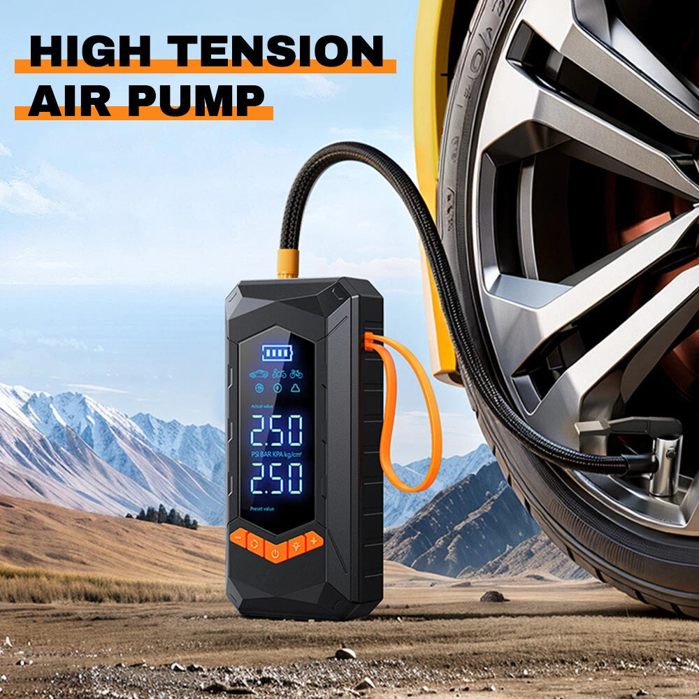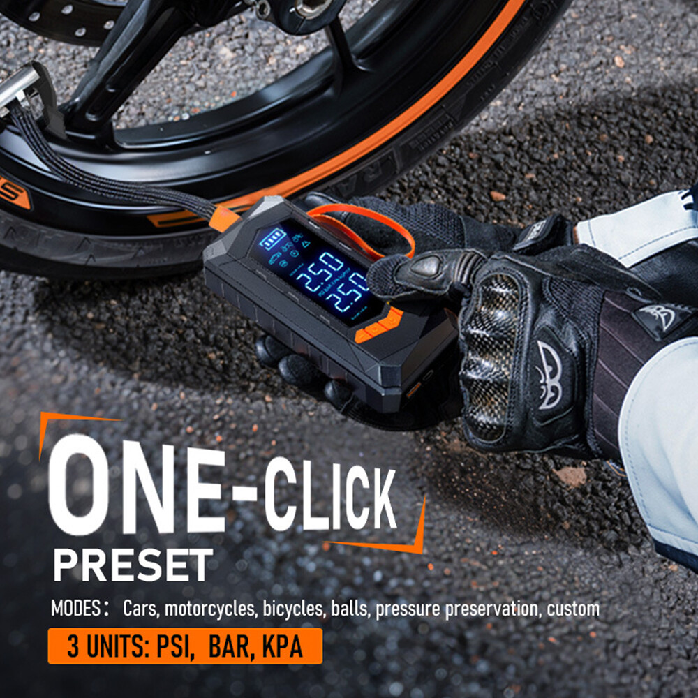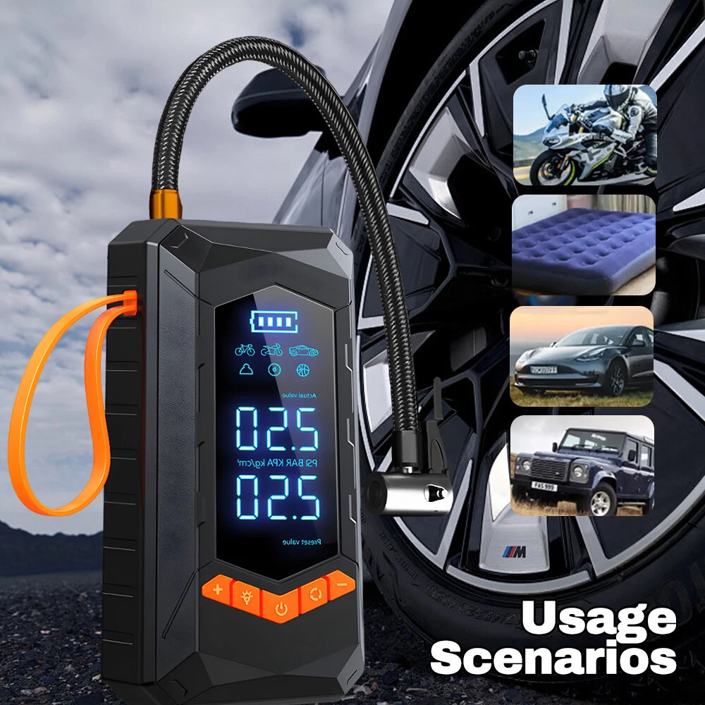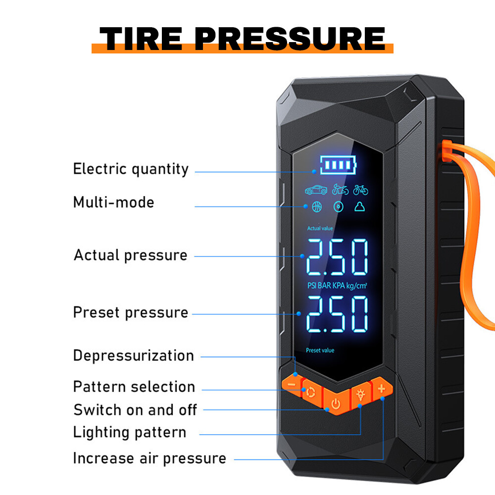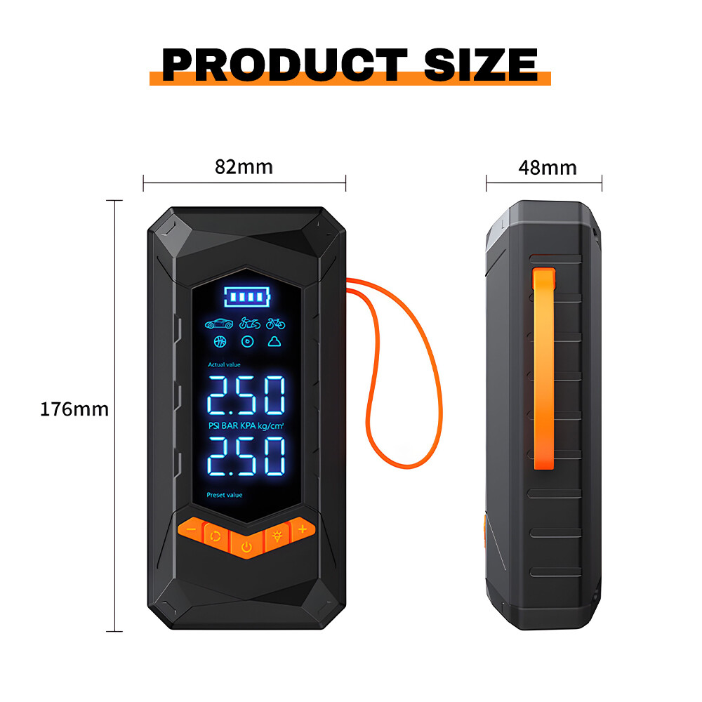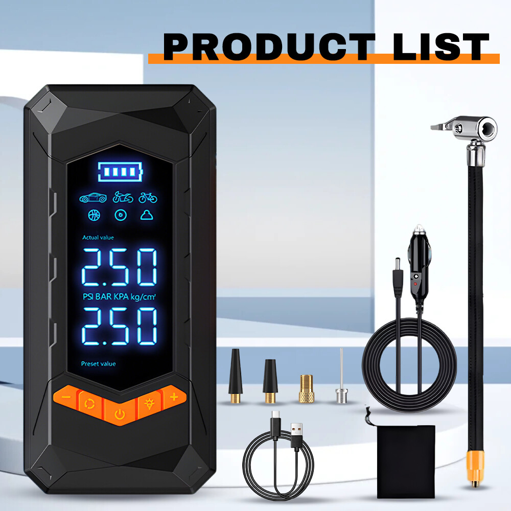 Purchasing Specifications authentication: CE、FCC、UL Product size: 15.5 * 7.5 * 5.7cm Net weight of product: 550g Product features: 1. Dual purpose model (2000mAh * 2 sections); 2. Wired inflation (3-meter power cord); 3. Emergency lighting; 4. Flashing lights; 5. SOS emergency light; 6. Digital display screen. Product List: Tire Inflator * 1 32cm threaded trachea * 1 Air nozzle four piece set * 1 Charging cable * 1 3-meter DC cable * 1 Storage bag * 1 Instruction manual * 1