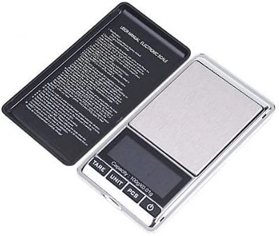 Platform Stainless steel, Division: 0.01g / 0.0001 oz ,0.0005T,0.1gn,0.001ozt,0.01dwt,0.05ct Display LCD with back-lit, auto-dim Units: g,OZ,T,gn,ozt,dwt,ct Counting Function Supported The performance oriented set is ideal for anyone looking for a precision pocket sized scale and serious about the accuracy. The pcs function gives you an accurate count and the hold function will lock weight readings. Will work great for any of your postage, cooking, medicine, hunting and jewelry. Specifications: 1. Condition: New 2. Max weight: 100g 3. Min weight: No 4. Units: G, oz., t, gn, ozt, dwt, CT 5. Accuracy resolution:0.01g, 0.001oz, 0.0005t, 0.1gn, 0.001ozt, 0.01dwt, 0.05ct 6. Power supply: 2 x AAA battery(not included) 7. Background light color: Green 8. Display: LCD 9. Color: Black 10. Plastic (housing), stainless steel (tray) 11. LCD screen size:1.77 x 0.67inch/4.5 x 1.7cm(l x w) 12. Item dimensions:4.57 x 2.52 x 0.71inch/11.6 x 6.4 x 1.7cm(l x w x h) 13. Weighing platform size:2.44 x 2.13inch/6.2 x 5.4cm(l x w) 14. Package size::5.51 x 3.54 x 1.02inch/14 x 9 x 2.6cm(l x w x h) 15. Weight:124g/4.37oz how to calibrate, 1. Make sure scale is placed on a leveled place and keep scale away from computer and radiation. 2.Turn on scale, remove all goods from the scale , press "mode" button till "cal" is shown. 3. Press "mode" again, number 100 will be displayed after "cal" flashes two times, then put the 100g weight on the middle of scale, it will be into normal weighing mode automatically when "pass" is displayed, at that time turn off the scale and remove 100g weight, calibration is done. Package includes: 1 x 100gx0.01glcd mini electronic jewelry scale 1 x user manual(Chinese & English) 1 x leather case note: Please remove the clear protect film from the scale before using .