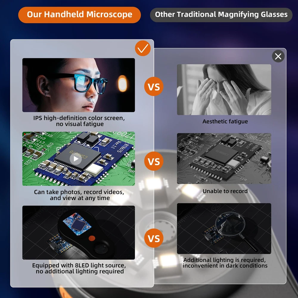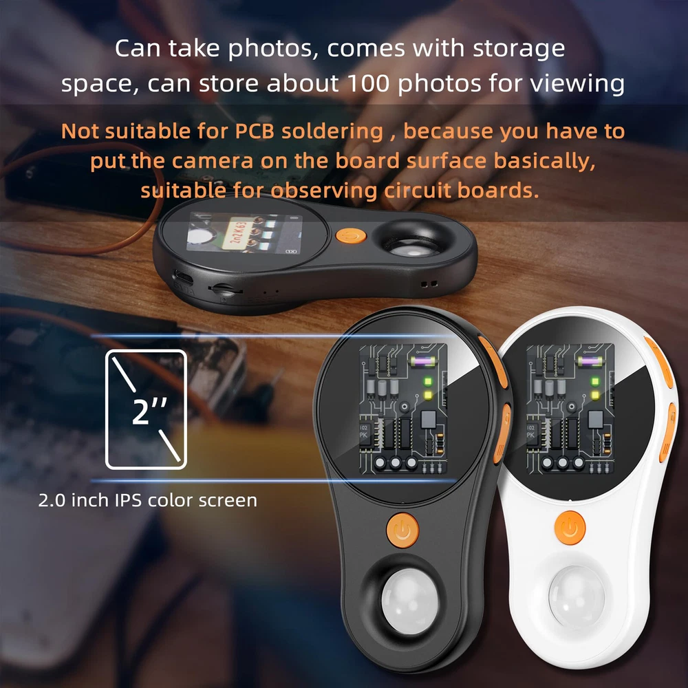 Features 1. Pixel: The 370 handheld digital microscope has 2 million pixels, allowing you to observe the details of the microscopic world clearly. 2. Portable design: This microscope adopts a handheld design, which is lightweight, easy to carry, and convenient for users to use. 3. Electronic amplification: With the help of electronic amplification technology, users can easily magnify the object they are observing without any laborious adjustments. 4. Easy to operate: This microscope is easy to operate; Users can easily use it without professional knowledge. 5. Widely applicable: This microscope is perfect for both students conducting scientific experiments and adults who need to magnify objects for work. It is made of PP material, can be used for a long time, has educational value, and can stimulate children's interest and curiosity in science. Specification Display screen: 2-inch IPS screen Pixel: 2 million pixels Magnification factor: 500x Focusing range: 0mm Light source: 8 LED lights Image format: JPG Video format: AVI Power supply: 600mAh Working time: about 1.5 hours Charging time: about 1.5 hours Supported systems: Windows XP/Vista/Win7/8/10/11, mac 11.0 and above Material: PP Color: Black, White Size: 11 x 6.6 x 1 cm Weight: 120 g Package Include: 1 handheld digital microscope magnifying glass 1 USB cable 1 manual 1 packaging box