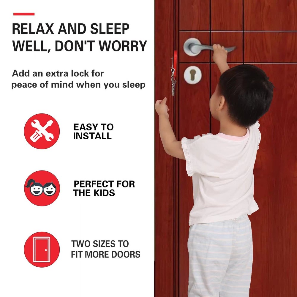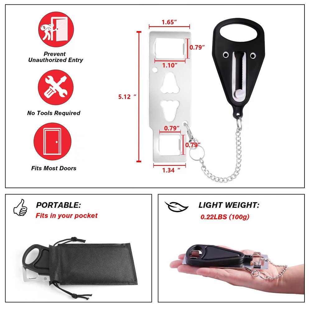 Home Security Door Locks addalock portable door locks will provide you with extra security and privacy to keep you safe, especially when traveling or staying in hotels. Portable Door Lock Security and Privacy Easy to Use Fit to Most Types of Doors Lock Special design, made of solid metal Small and light, easy to carry to pocket WARNING < p>1. Please make sure there is more than 0.12" (3mm) gap between the door frame and the door, if the door has no gap, it may not fit you. 2. Only for inward opening doors 3. The sides of the door must be flat and not protruding 4. The thickness of the door bump must exceed the door lock Thickness of cylinder and portable door lock 0.6 inches (1.5 cm). Packaging 1 x Portable Door Lock 1 Storage Bag 【ADDITIONAL SAFETY AND PRIVACY】: If you are one of those who do not trust hotel doors and the latches, portable door lock will provide extra security and privacy to you, make sure you are safe, especially when traveling or staying in hotels alone. Add an extra lock that is small but will hold your door shut firmly and allows you for peaceful sleep. The door can't be opened from the outside, not even with a key. 【FIT MOST DOORS】: 3 in 1 special design is suitable for most types of the door lock. Perfect for hotels, dormitories, apartments, bathrooms, bedrooms, or private rooms. Door locks also can be applied to avoid pets going out and to prevent children from opening their doors to strangers. not for sliding door , double open door , slat door, and swing out door. 【SIMPLE TO USE】: The hotel safety door lock is easy to install or remove without any tools. The travel lock is small, light compared to other portable locks that can be carried in your pocket or handbag to provide self-protection. It only applied door opening inward and the door crack must be over 0.12inch to ensure the single door will not be stuck, the door without seam cannot be applied. 【HEAVY DUTY LOCK】: Resistance door devices are made of solid metal which is durable and can serve you for a long time.304 stainless steel precision casting thickening that is strong enough not to bend with force. Greatly improves security and prevents unauthorized entry. 【DESIGN UPGRADE】: Travel door lock has novel and unique and warranted against manufacturing defects. The Security devices are fixed by a thread, which is more stable after installation. Brings you additional safety, security, and privacy. If you have any questions about the product, please contact us immediately