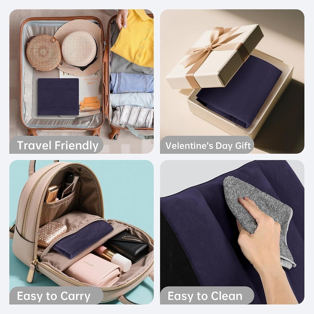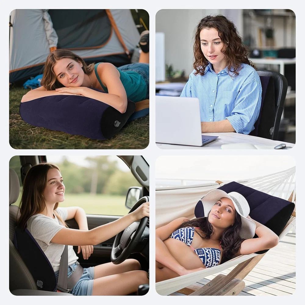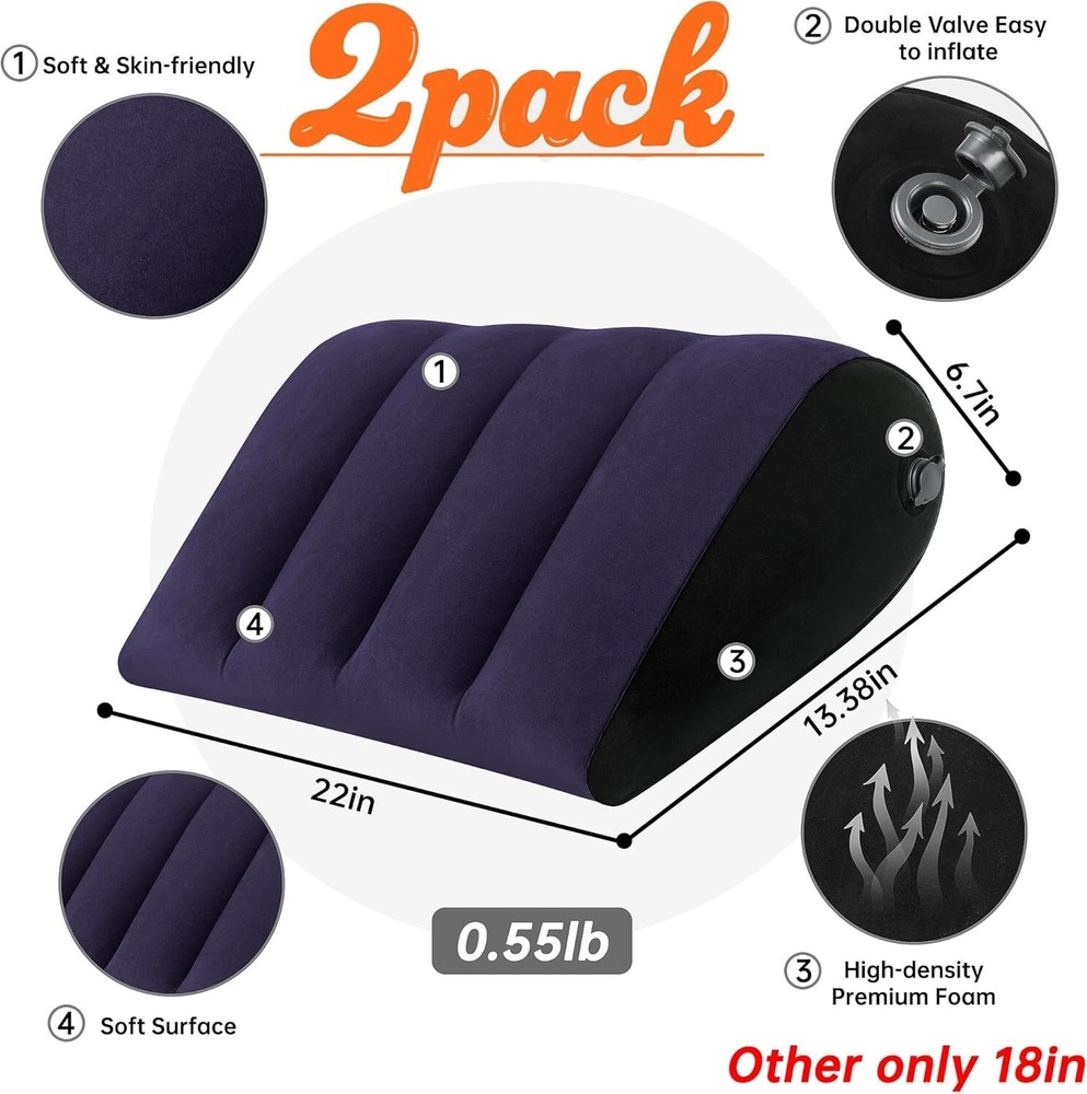 Portable Inflatable Wedge Pillow 2 Pack, Body Positioners for Sleep Support, Adjustable Travel Cushion- Lightweight Bed/Leg/Partner Support Pillow with Fast Inflation, Blue(Large 22inch) About this item Alleviates Discomfort: Say goodbye to back pain, knee pain, and leg pain with the leg elevation pillow. 2 Pack wedge pillow is a great idea for bedridden, disabled, elderly, side-lying people, acid reflux, shoulder arthritis, spinal degenerative arthritis, zero gravity sleepers, etc. Fix body position and bearing weight. Let you lie down and sit comfortably. The ideal leg elevation pillow-raising your legs can help reduce muscle and joint strains, promote healthy circulation, and help reduce nerve pressure, making you feel completely comfortable and relaxed Inflate and deflate quickly-you can inflate the wedge pillow with your mouth, and it will be filled with air in less than 30 seconds. You can easily deflate by pressing the valve. Lightweight and portable-light weight and easy to store. You can take it with you, it will not affect any of your activities, travel, beach, vacation are great. Very suitable for takeout. High-quality material-PVC flocking. It can be cleaned directly or with a wet wipe. Product Description Portable Inflatable Wedge Pillow for Versatile Support 2 Pack Wedge Pillow Portable Folding Body Positioners Lightweight Wedge Pillow Lightweight and portable, this product is easy to store and transport. You can carry it with you without any hindrance to your daily activities, whether traveling, visiting the beach, or enjoying vacations. Versatile for multiple scenarios! They offer exceptional value for money Here’s a fantastic 2 - pack of wedge pillows that are incredibly versatile for multiple scenarios! Whether you're in the car, on the bed, at the beach, or at work, these pillows are your perfect companion. Compared to similar products from other brands, our pillows are longer in length, which means they can provide more comfortable support. Made from premium materials, they are soft, durable, and able to maintain their shape well. Easy Inflation and Portability Inflate this wedge pillow in less than 30 seconds using just your mouth. Deflation is equally quick and easy - simply press the valve. Its lightweight design and easy storage make it a perfect travel companion for vacations, beach trips, and other activities. Quality and Safety Made from PVC flocking, this pillow is free from harmful chemicals and unpleasant odors. It can be cleaned directly or with a wet wipe, ensuring it's always fresh and ready for use. It's a soft, comfortable, and safe pillow that you can rely on for quality.