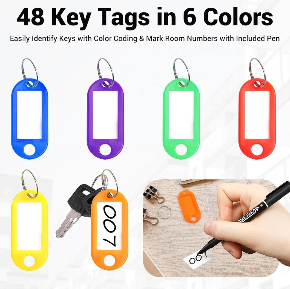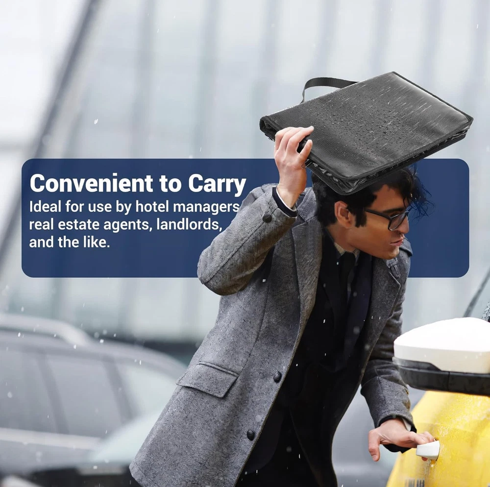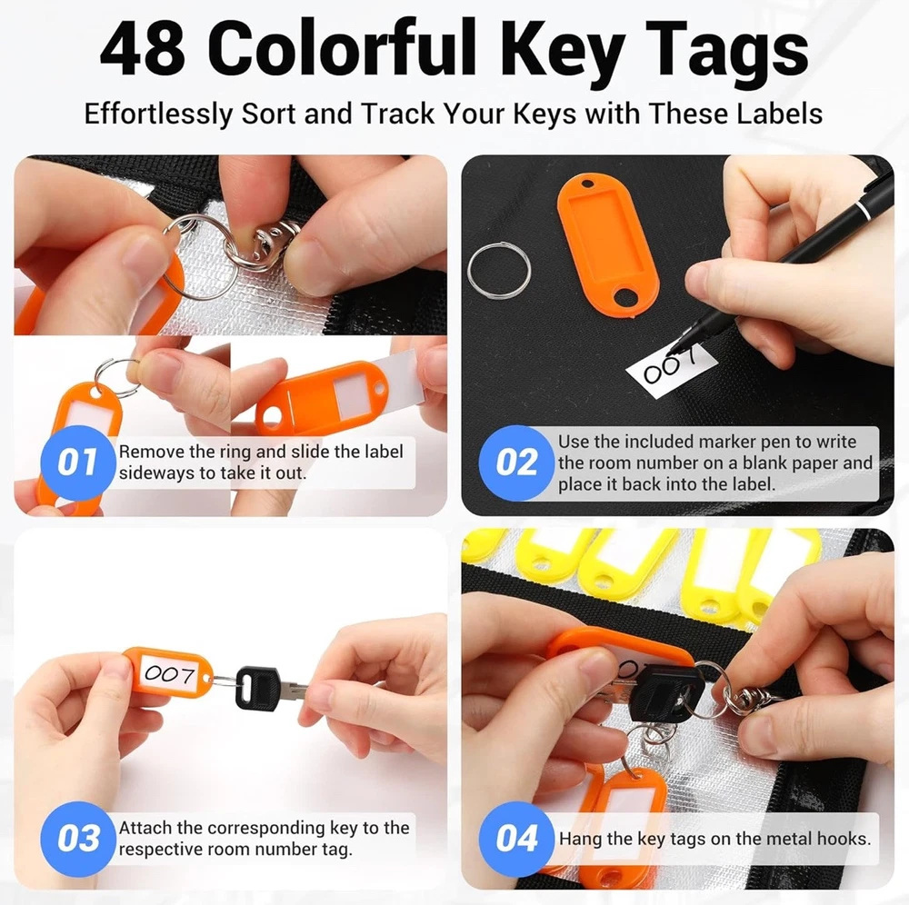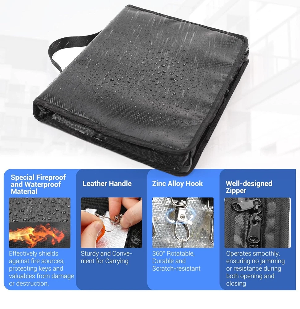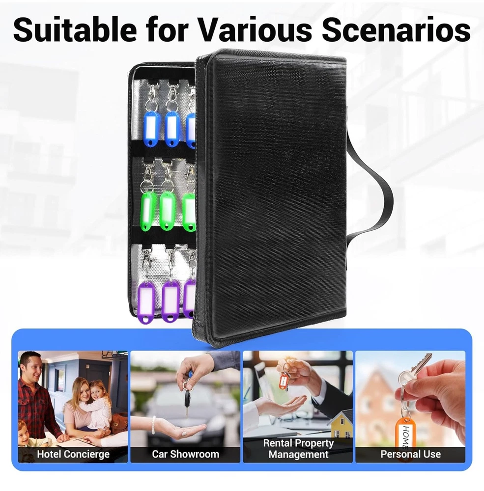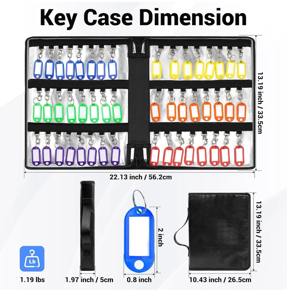 Waterproof & Fireproof Key Organizer: Engineered with a 3-layer construction for ultimate protection. Outer layer: Premium silicone-coated fiberglass (fire & water-resistant). Middle layer: High-density cardboard for structural integrity. Innermost layer: Fireproof aluminum foil backed fiberglass. Shield your keys from fire, water, moisture, and extreme heat up to 2000°F Large Capacity & Portability: The dimensions of the portable key organizer are 10.43 x 13.19 x 1.97 inches. It can hold up to 48 keychains and comes with 48 key tags in 6 different colors, plus an additional marker pen for immediate labeling of your keys. The key case allows for comfortable storage and categorization of your keys Premium PU Material: Crafted from high-quality PU leather, our zippered key organizer ensures longevity and a professional look. The smooth PU surface allows for easy cleaning and maintenance. Simply wipe down with a damp cloth to keep your key organizer looking as good as new 360° Rotating Hook Design: Each keyring is made from zinc alloy, securely attached to the key holder, making it unlikely to fall off. The hook is resistant to rust and rotates 360°, ensuring a firm hold that makes it easy for you to store and retrieve keys without worrying about breakage or rust. By increasing the storage space of this key organizer, it effectively solves the problem of key clutter caused by size Portable & Secure: Built with a handle, this key storage case allows easy transport from one location to another. The secure zip-around closure ensures keys stay safely in place during transit, preventing loss or mix-ups Efficient Key Management System: Simplify your key organization with our zippered key holder, perfect for real estate agents, hotel managers, property managers, landlords, business owners, and more. It's equally suitable for car rental services, office leasing, home rentals, car dealerships, and repair shops. Keep your keys neatly categorized so you can locate them quickly. Say goodbye to the frustration of rummaging through cluttered bunches of keys